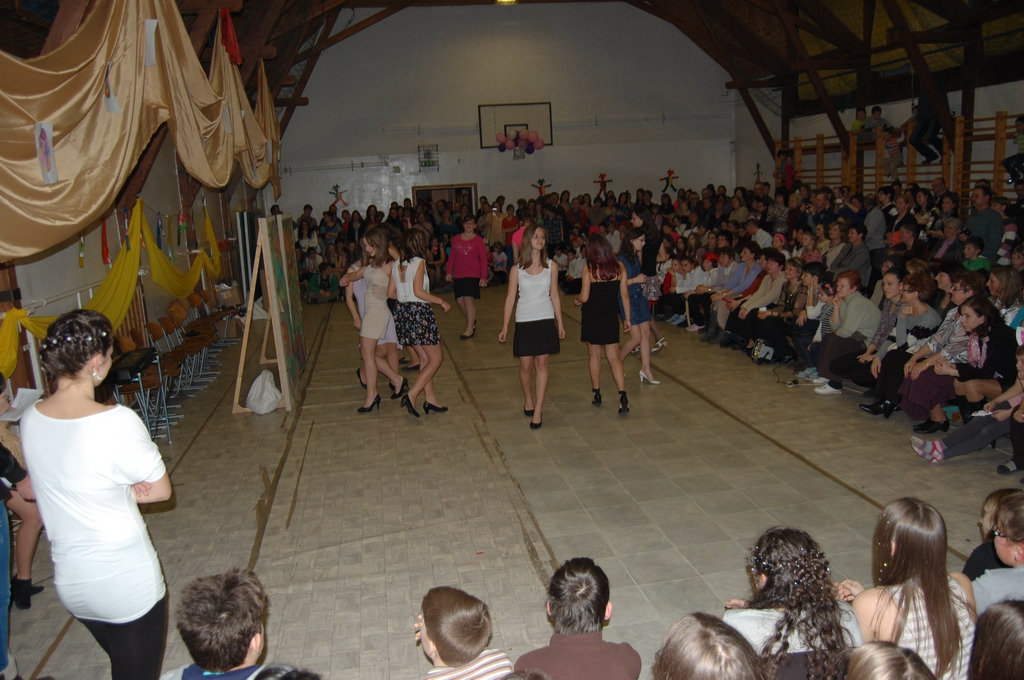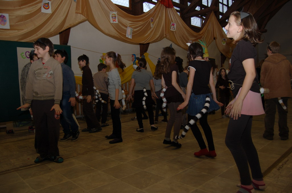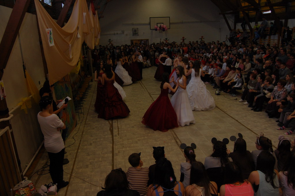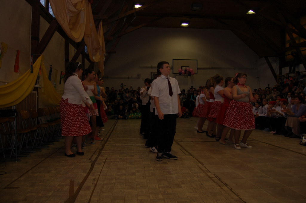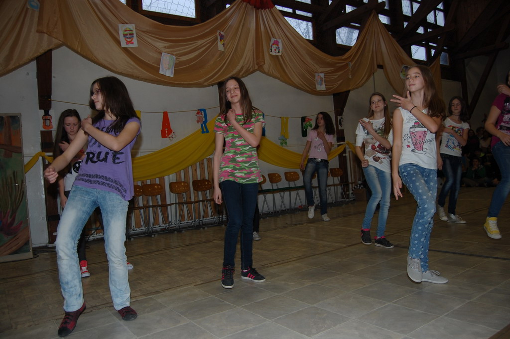 Az igazgató úr megnyitó beszéde után a 6. és 7. osztály társastáncosai gyönyörű ruhában angolkeringővel kezdték meg a szórakoztató jelmezes bemutatókat. Szinte minden felsős részt vett a vidám műsorban, melyben az osztályok jobbnál-jobb élménydús zenés jelenetet, paródiát, táncot, éneket adtak elő, a közönség (tanárok, szülők, kisdiákok) nem kis örömére. A farsangi karnevál első része társastáncosaink kör cha-chájával fejeződött be.