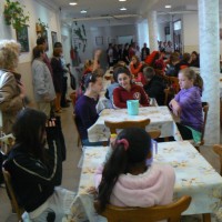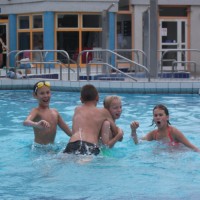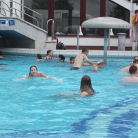 Az ózdi gyermekeket az iskola bejáratánál vártuk, majd közösen elmentünk a Szent László templomba. Ott a képviselőtestület elnöke fogadott, majd templom nevezetességeinek bemutatása következett. A karzaton a templom karnagya orgona kíséretével közös éneklés következett. A galériába való átmenet utána Takács István templomfestő „hagyatékát” (festményeit, ruhaterveit) néztük meg. Az iskolába való visszatérés és ebéd után közös strandolás vette kezdetét a „Zsóri” körbenézése után.