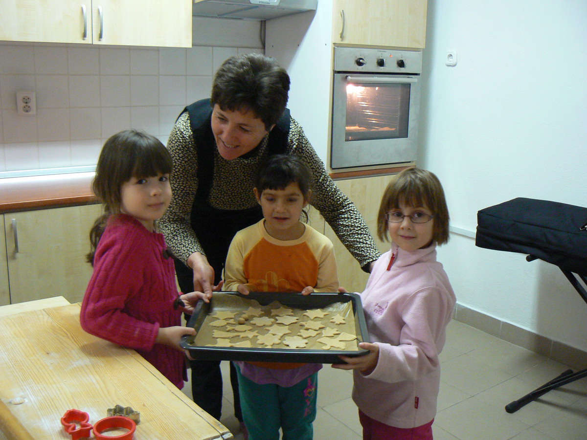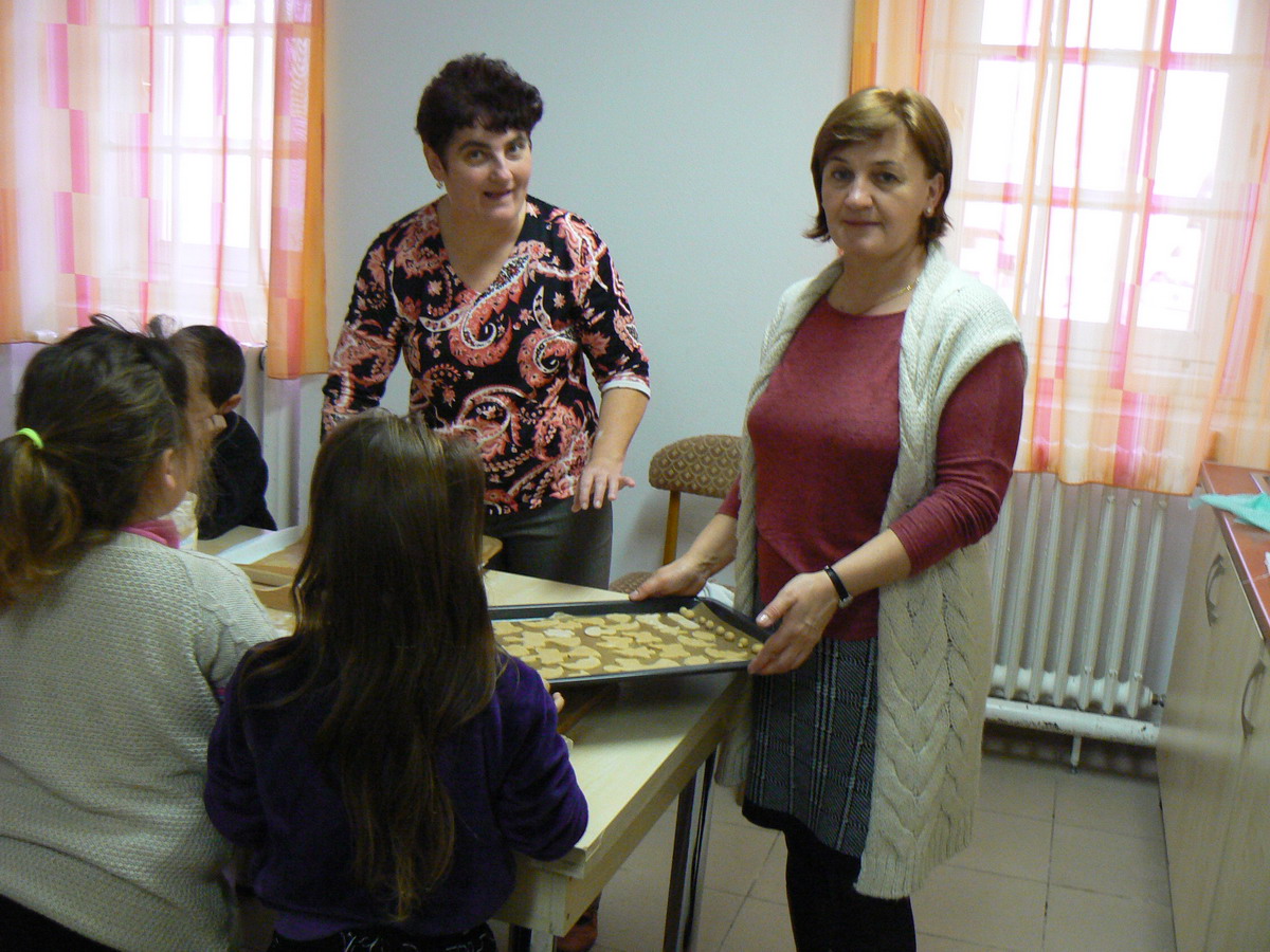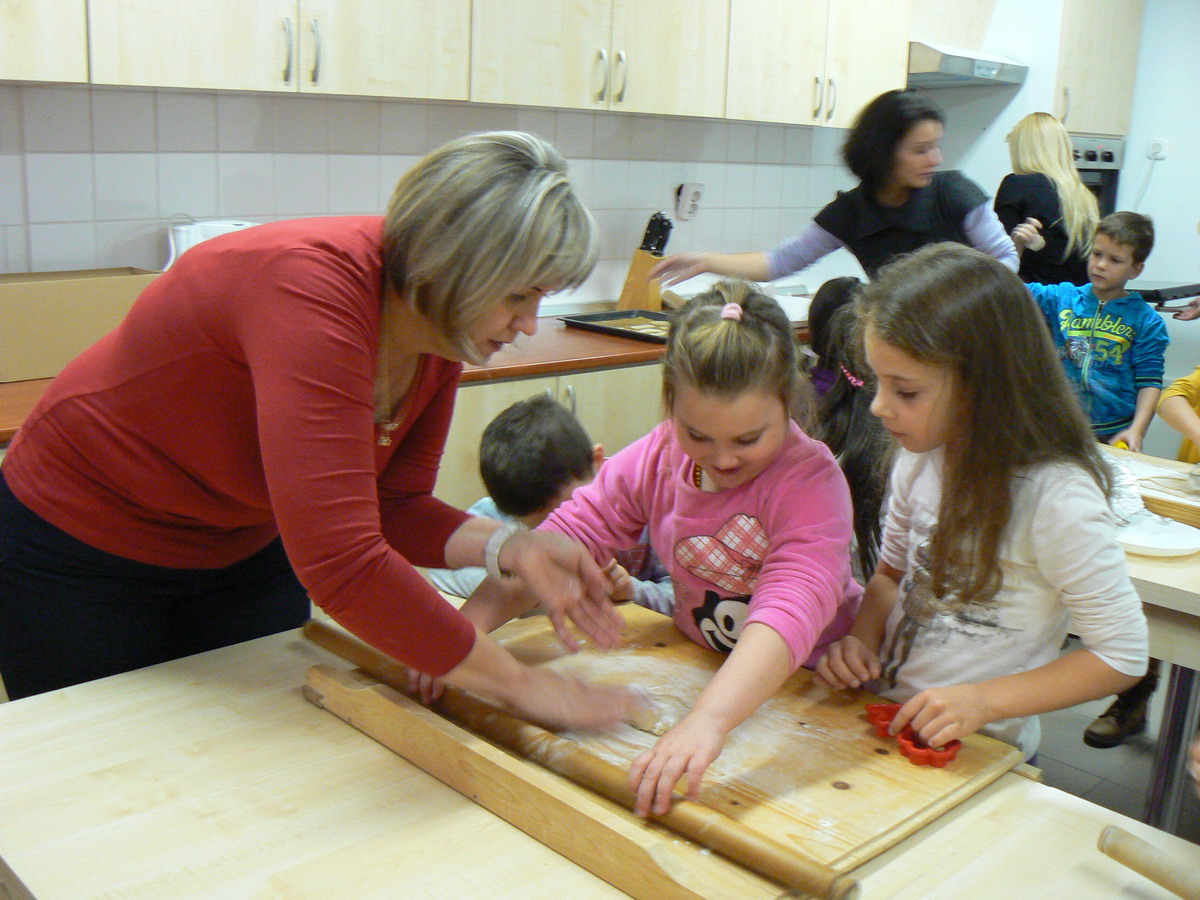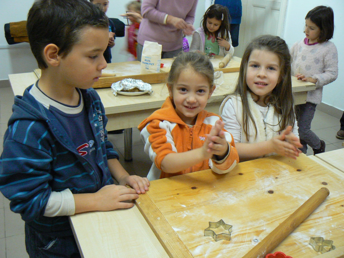 Ezután két részre vált a csoport. Karácsonyi mézes süteményeket formázhattak a tankonyhában a kicsik a napközis tanítónénik segédletével. Másik részük adventi koszorút színezhetett és karácsonyi dalokat énekelhetett, hallgathatott meg.
