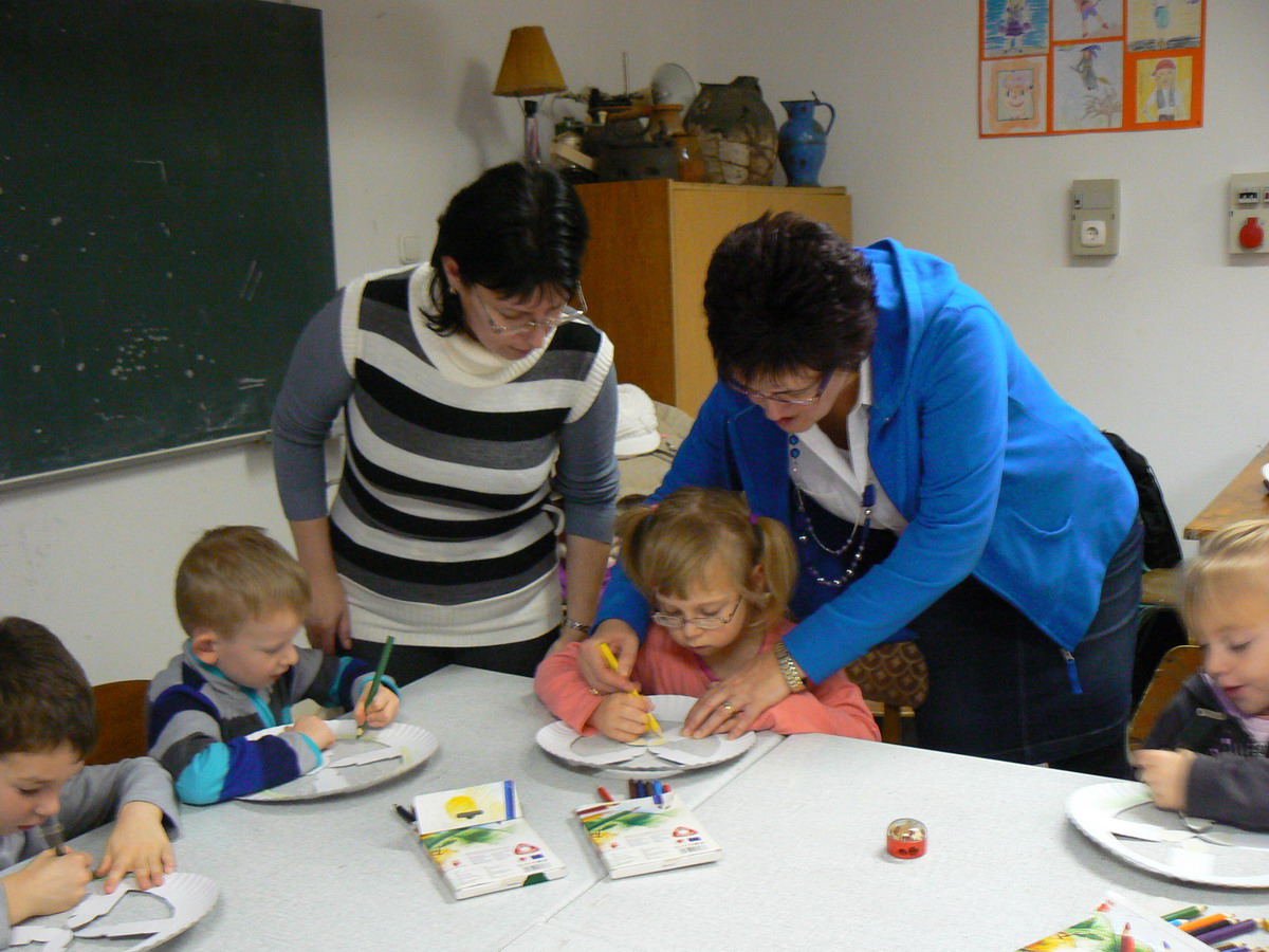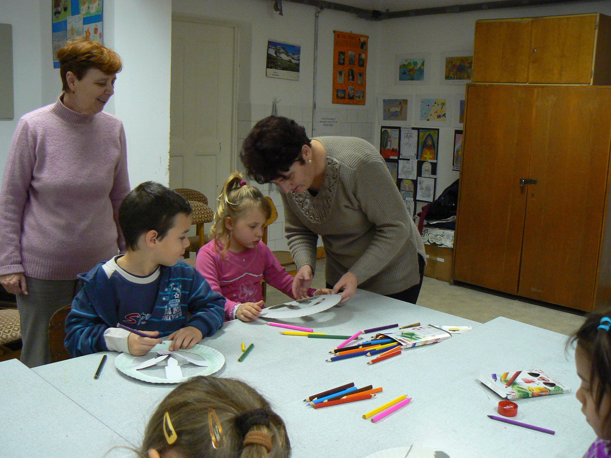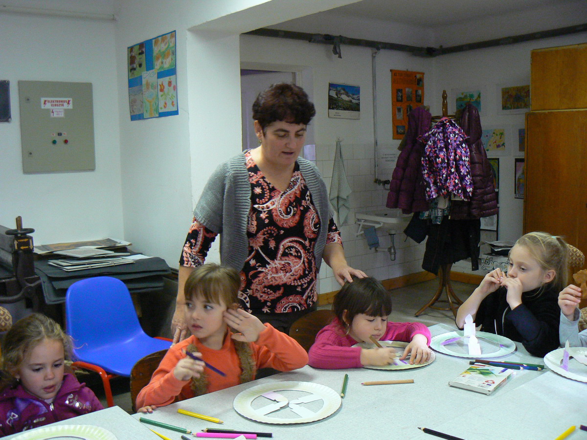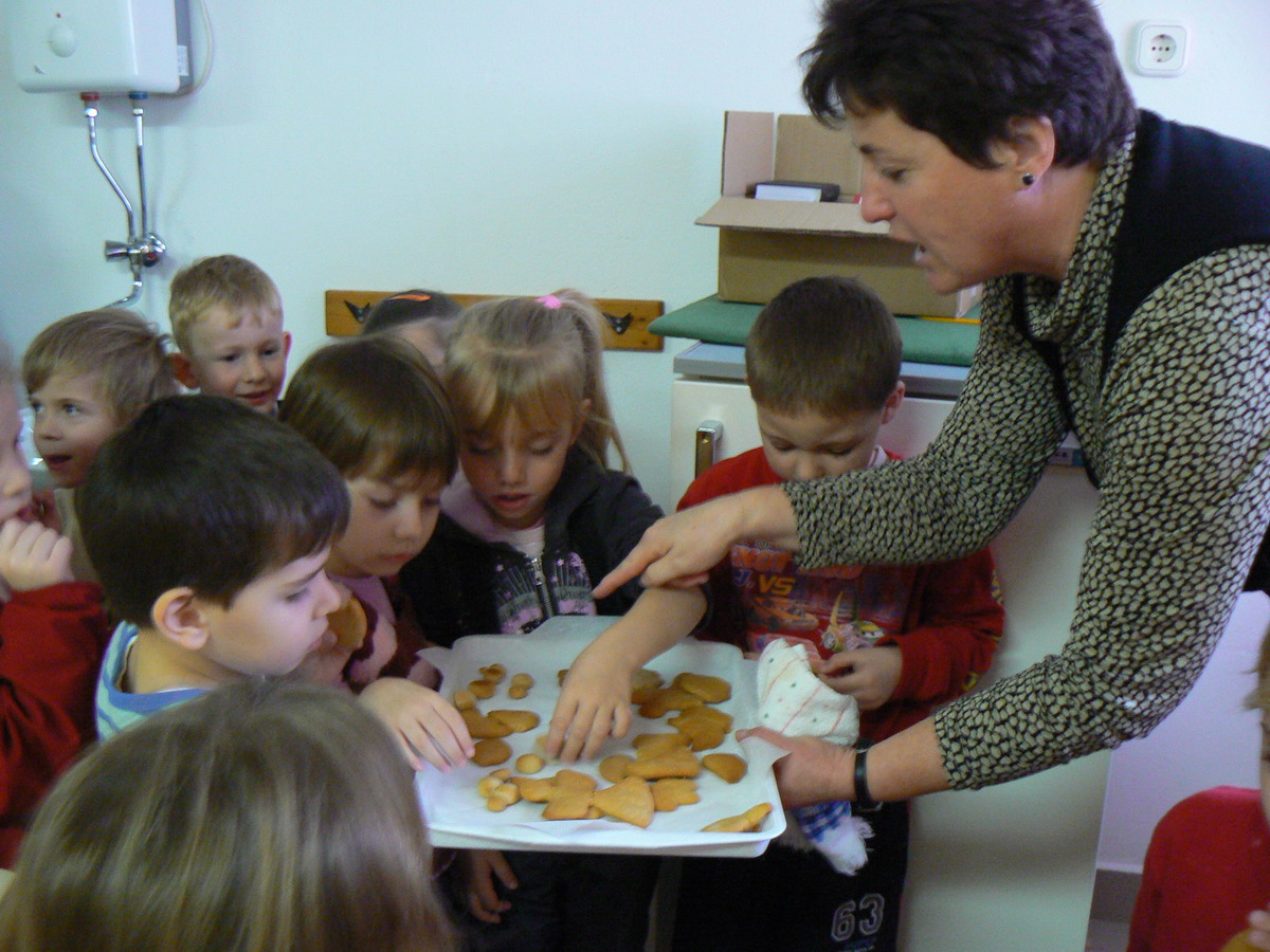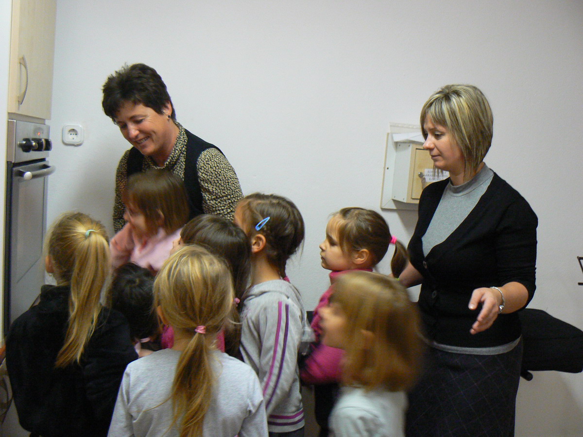 Ezután két részre vált a csoport. Karácsonyi mézes süteményeket formázhattak a tankonyhában a kicsik a napközis tanítónénik segédletével. Másik részük adventi koszorút színezhetett és karácsonyi dalokat énekelhetett, hallgathatott meg.