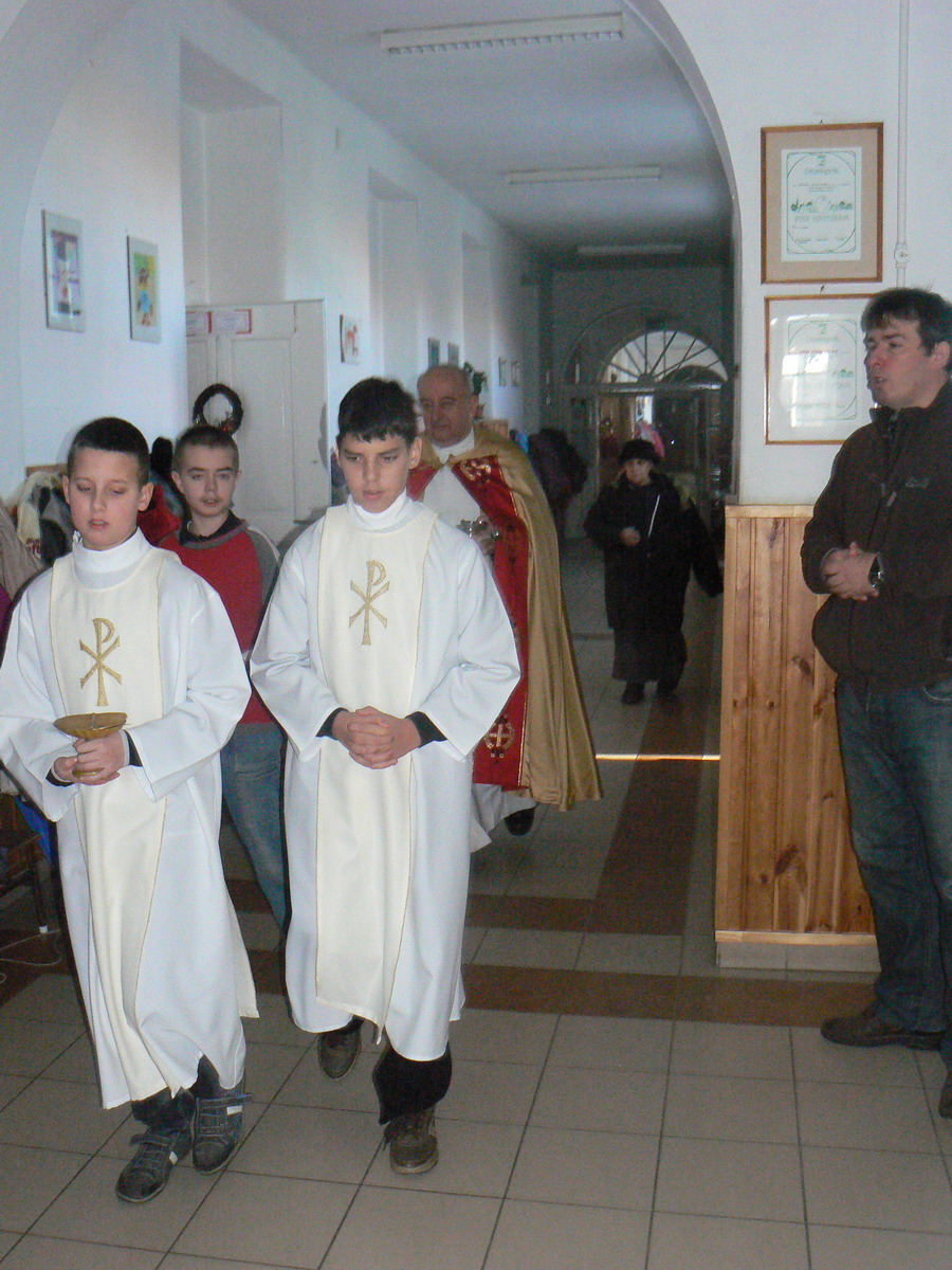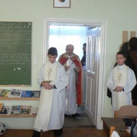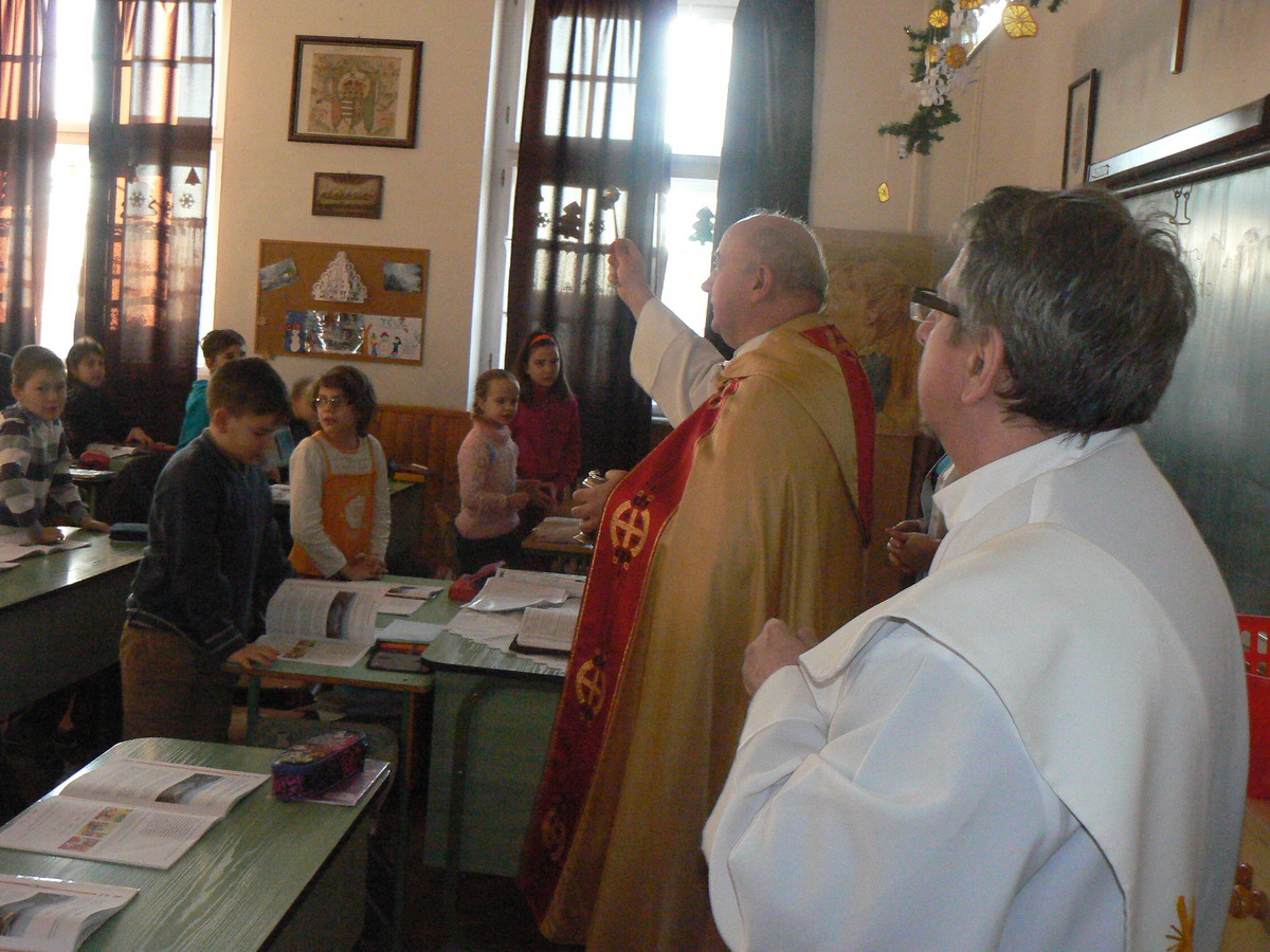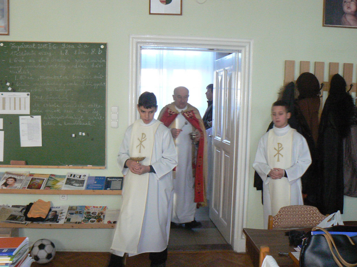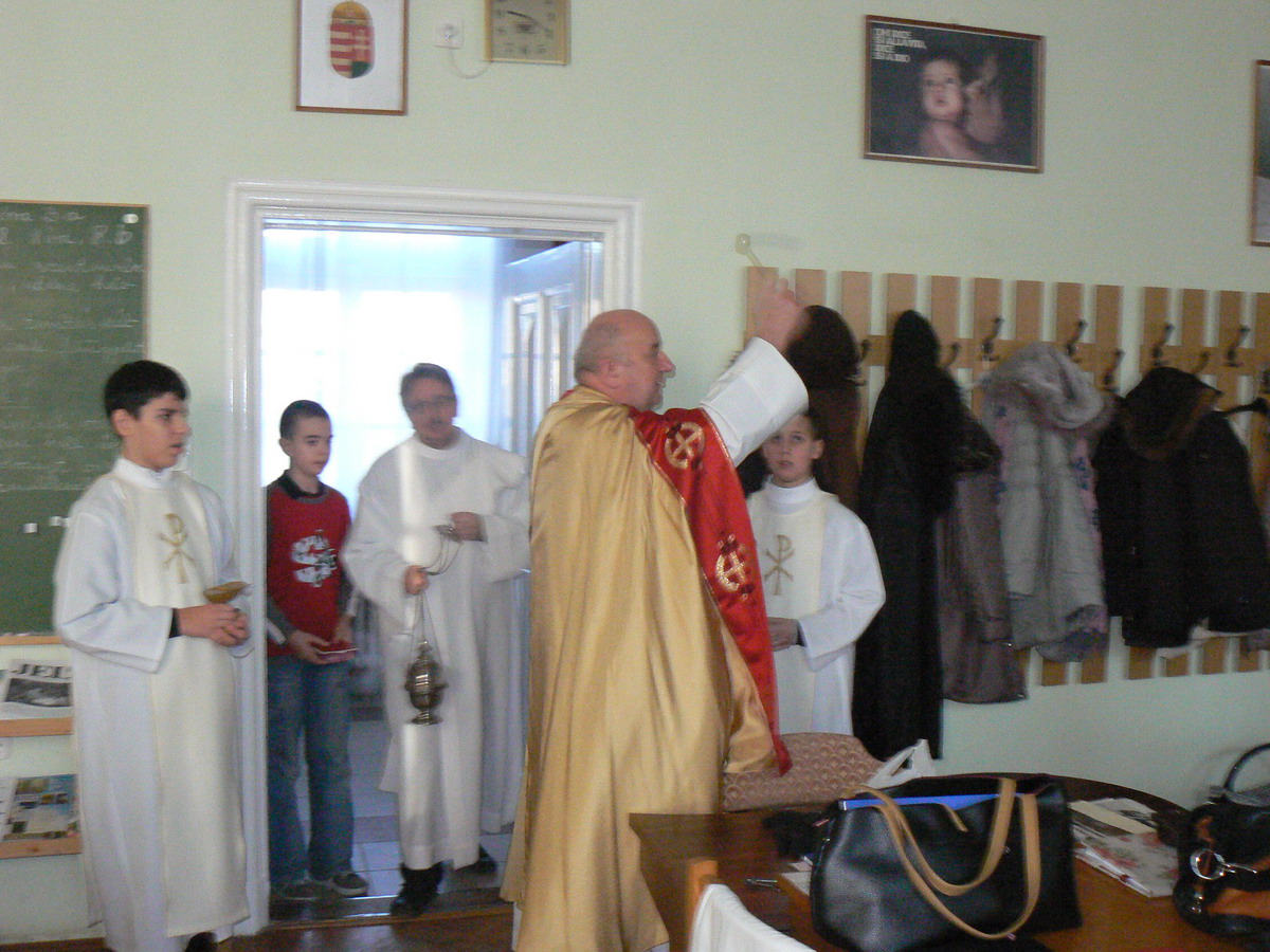 Iskolánkban is ennek megfelelően ünnepeltük meg a napot. Reggel 8 órakor szentmisével kezdtük a napot dr. Berkes László pápai prelátus, a Jézus Szíve templom plébánosa celebrálásával. Ezután a plébános atya körbejárta az iskolát, és a frissen szentelt szenteltvízzel megszentelte az osztálytermeket.