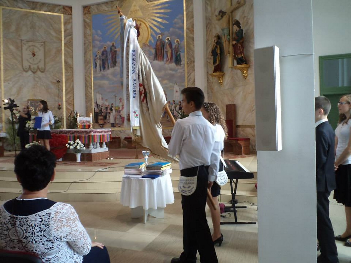 44 nyolcadik osztályos tanuló búcsúzott iskolánktól 2015. június 12-én hálaadó szentmise és az azt követő ballagási ünnepség keretében. A búcsúzókat gyönyörűen feldíszített osztályok és folyosók várták a 7. osztályos tanulóknak és szüleiknek köszönhetően. A szentmisét Dr. Berkes László pápai prelátus plébános úr celebrálta. A búcsúzó műsort a 7. osztályos osztályfőnökök Fehérvári Dénesné és Plank Gábor készítette és rendezte.