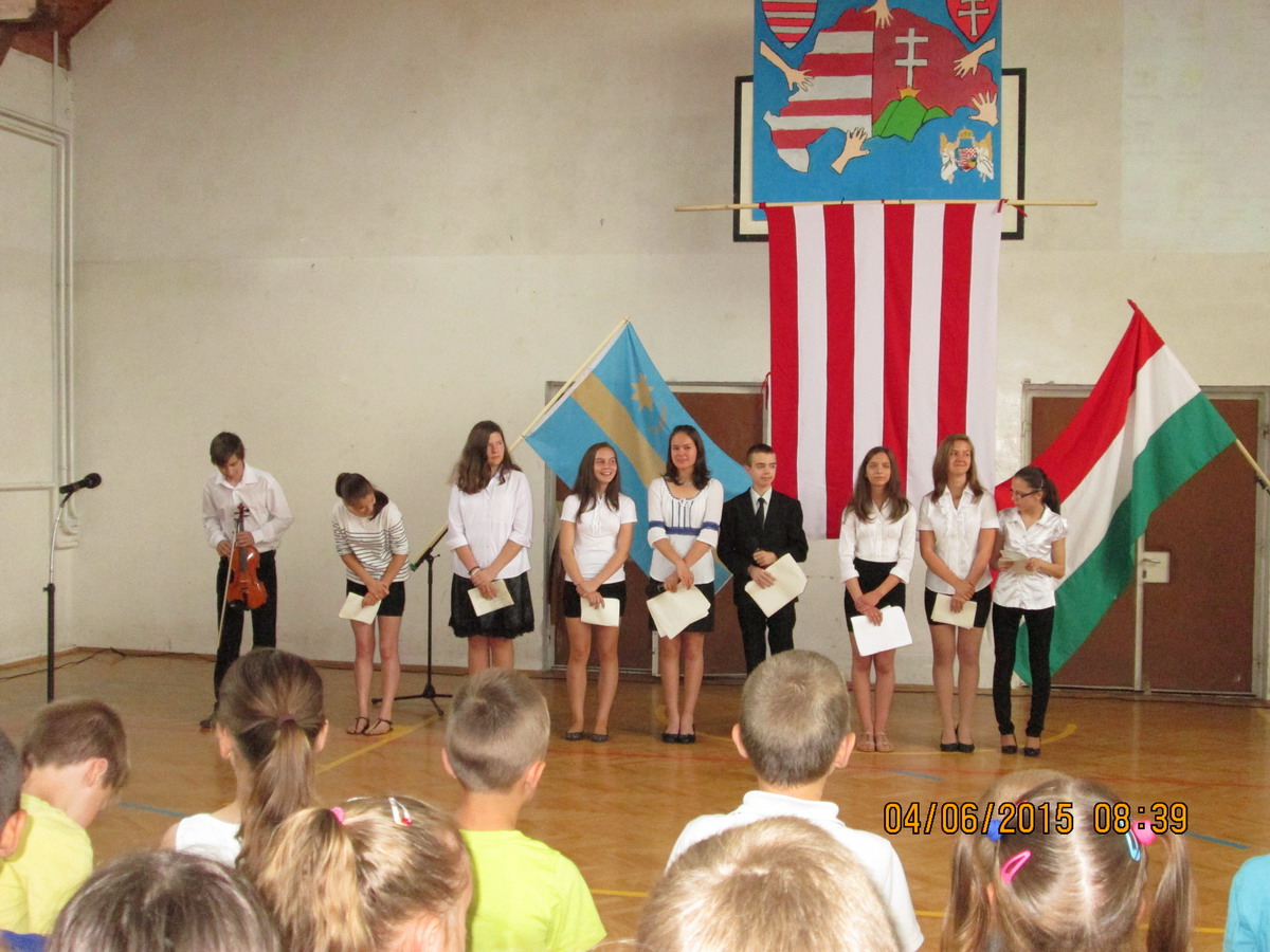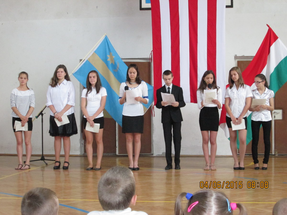 95 éve kényszerítették hazánkra a trianoni diktátumot. Erről emlékeztünk meg június 4-én. A 7.b osztályos tanulók adták elő a megemlékezés műsorát. A műsor végén Nagy Mátyás 8.a osztályos tanuló hegedűvel kísérte a székely himnusz eléneklését.