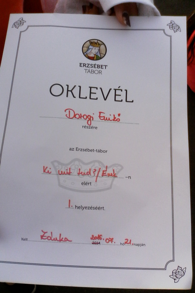 Az utazás reggelén jó volt újra látni a régi társakat. Esős napon indult velünk a vonat Mezőkövesdről, ahogy közeledtünk Zánka felé, egyre jobban kitisztult az idő. A vonatról leszálltunk, majd elfoglaltuk a szálláshelyeinket. Kicsomagoltunk, amit a lányok lényegesebben hosszabb idő alatt tettek meg, mint a fiúk. Kézműves foglalkozás várt estig bennünket. Készíthettünk illat párnát, akár gyöngyöt is fűzhettünk. Este feltérképeztük a környéket. A következő napon Erzsébet vetélkedőn vettünk részt, csoportokban Sok feladat volt, például középkori frizurát készítettünk, szerelmes levet írtunk, várat építettünk, történelmi totót töltöttünk ki Erzsébet korából, életéről. Este koncerten vettünk részt, az Ethnosound együttessel zenéltünk műanyag csöveken, nagyon érdekes és élvezetes volt. Másnap vízi akadályversenyen mérhettük össze erőinket. Vizet hordtunk a Balatonból, lepedőlabdáztunk, lasztit söpörtünk egy meghatározott pályán, kötelet húztunk. Az öltözéses feladatban a pólót le és felvenni kellett a csapat tagjainak egymás után, időre öltöztek, természetesen a fiúknak ment gyorsabban. Sokat nevettünk a feladatok alatt is. Közben azt is megtudtuk, hogyan kell szotyival hódítani a lányok körében. Rengeteg jó dolog történt a tábor alatt, láttunk működő 3D-s nyomtatót és az elkészült figurákat, zenélő gyümölcsöket, virtuális szemüveget próbálhattunk ki különböző szoftverekkel, játékokkal, mozgássérültekkel sportolhattunk. Igen hasznos és érdekes programok voltak. Utolsó előtti nap „Ki mit tud?”-ra került sor. A mi csoportunkból is volt fellépő. Ének kategóriában indult Dorogi Enikő és első helyezést ért el, nagyon szurkoltunk neki és büszkék vagyunk rá.