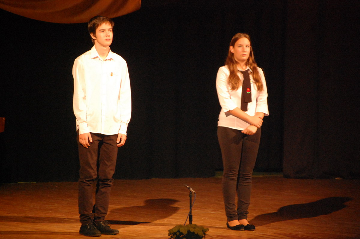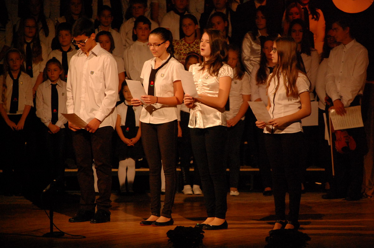Verses-zenés összeállításunkban minden osztály legjobbjai vettek részt. Nagy öröm volt számunkra, hogy mostani tanítványaink mellett régi diákjaink is jelen voltak ünnepségünkön. Ők meghallották hívó szavunkat, és eljöttek velünk ünnepelni. Van közöttük vegyészmérnök, hegedűtanárnő, tanítónő, óvónő, egyetemi hallgató, középiskolás diák, leendő mérnök, matematikus. Ők beálltak az énekkar soraiba és verset is mondtak. Közülük Török Bernadett és Nagy Mátyás csodás hegedűjátékukkal kápráztatták el a közönséget.