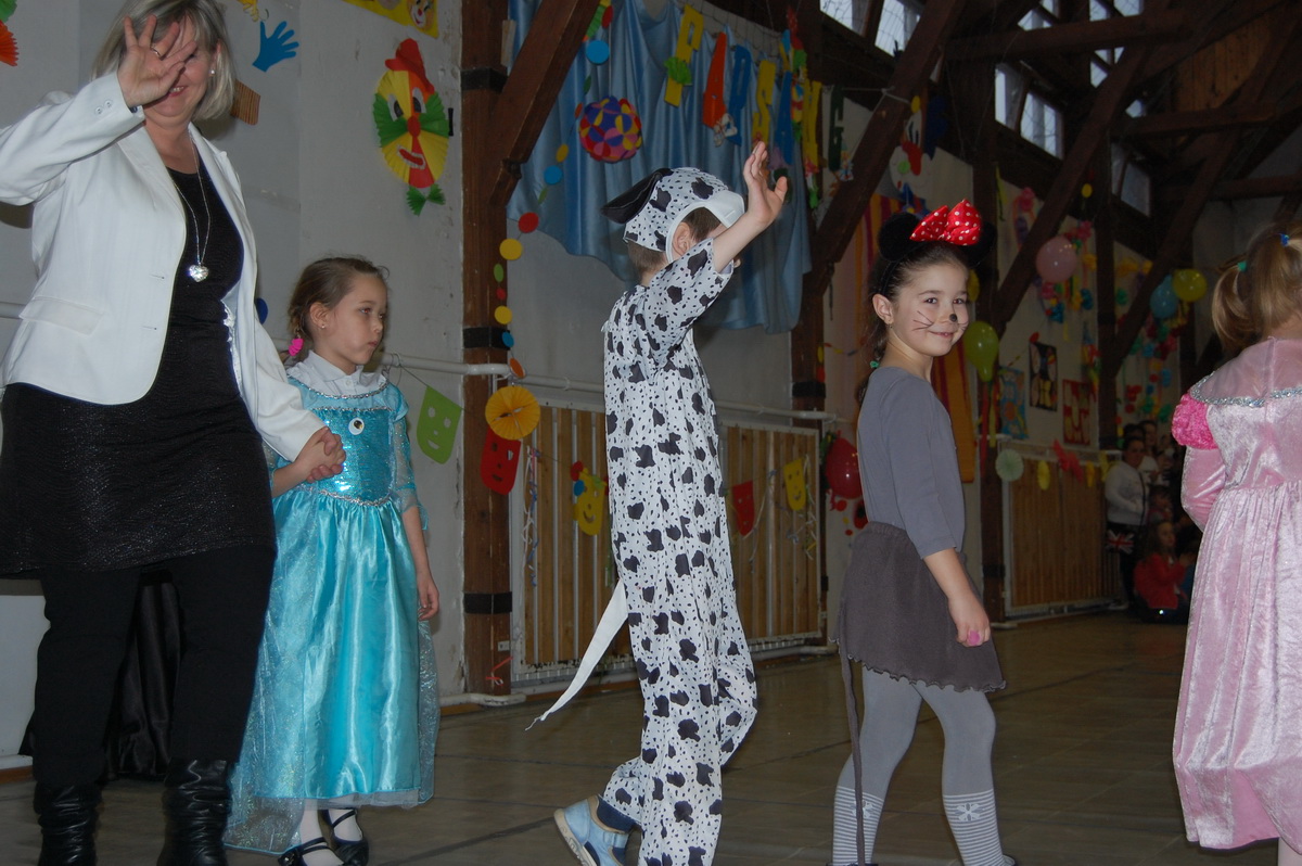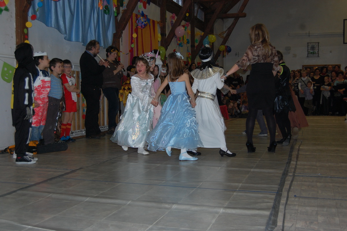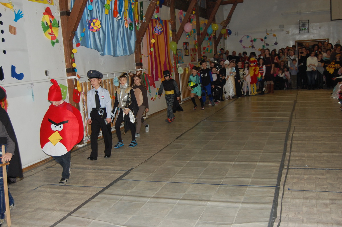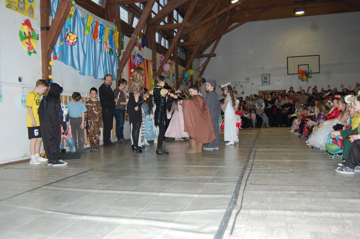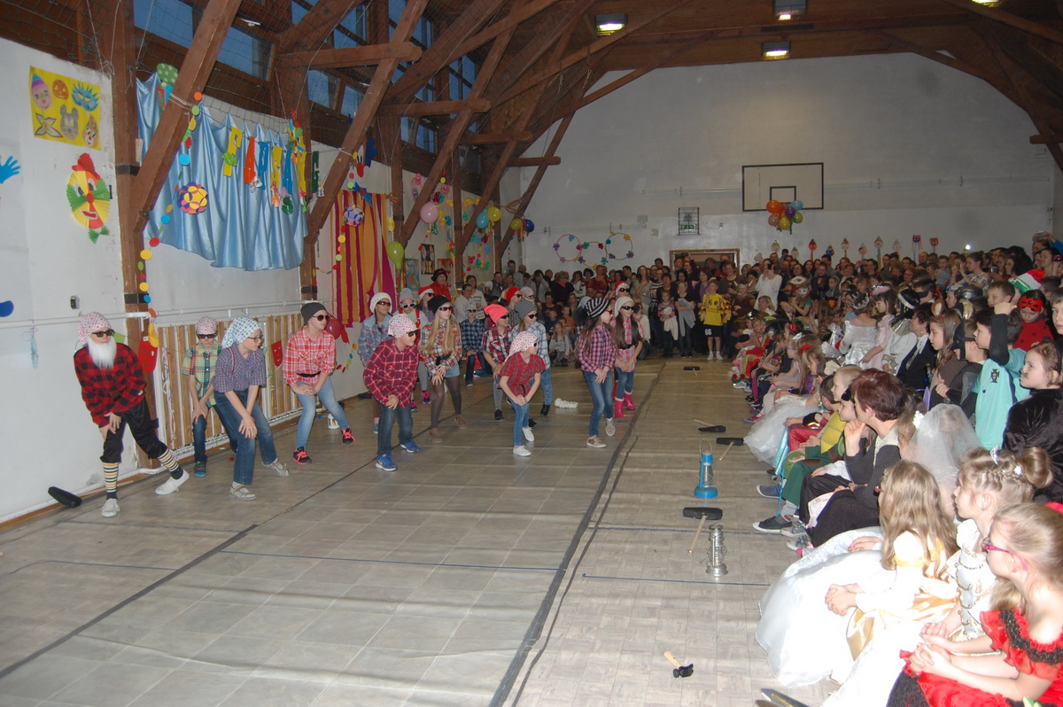 Érdekes volt látni, hogy farsangi énekükhöz-táncukhoz a szülők is csatlakoztak és ők fújták a talpalávalót. Ők a 2.a-s apukák és anyukák voltak. A 4.b-s lányok még poharas produkcióval is megörvendeztettek bennünket. A többi osztály remek, ötletes jelmezei nagy tapsot csaltak ki a megjelent szülőkből, rokonokból és ovisokból.