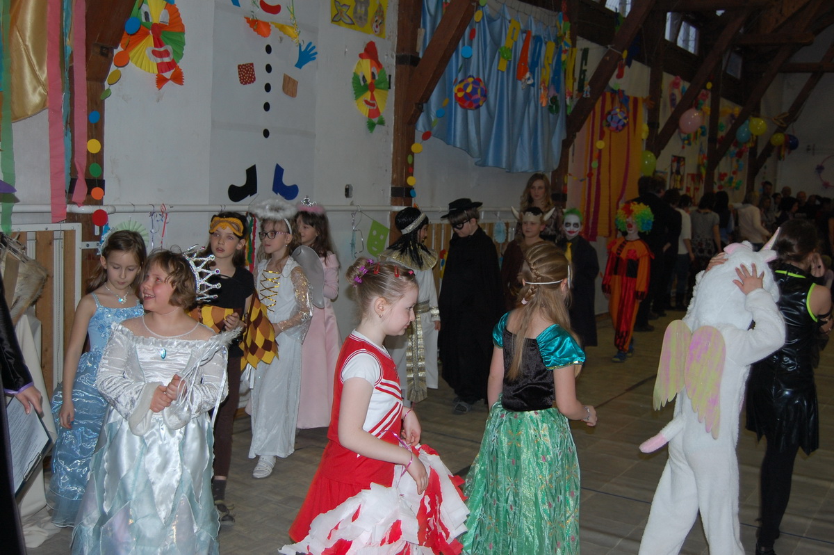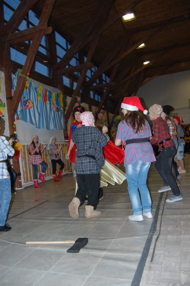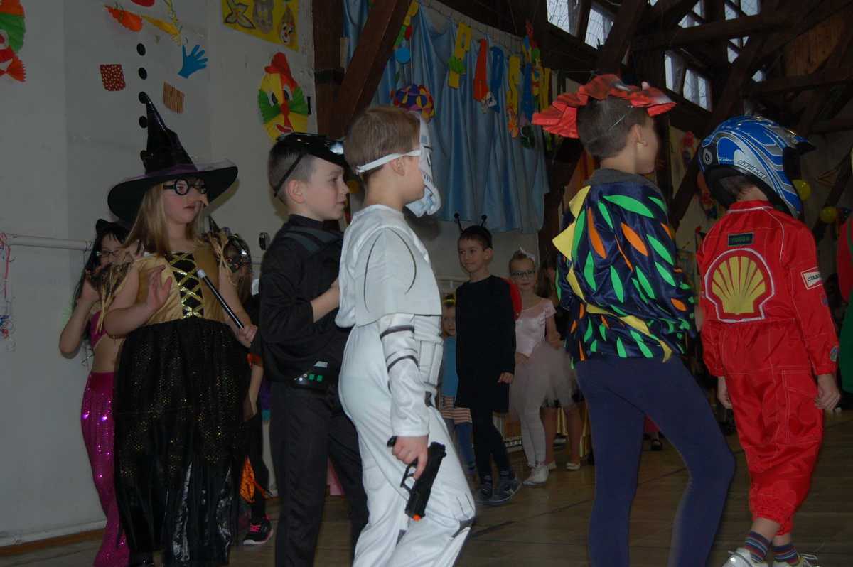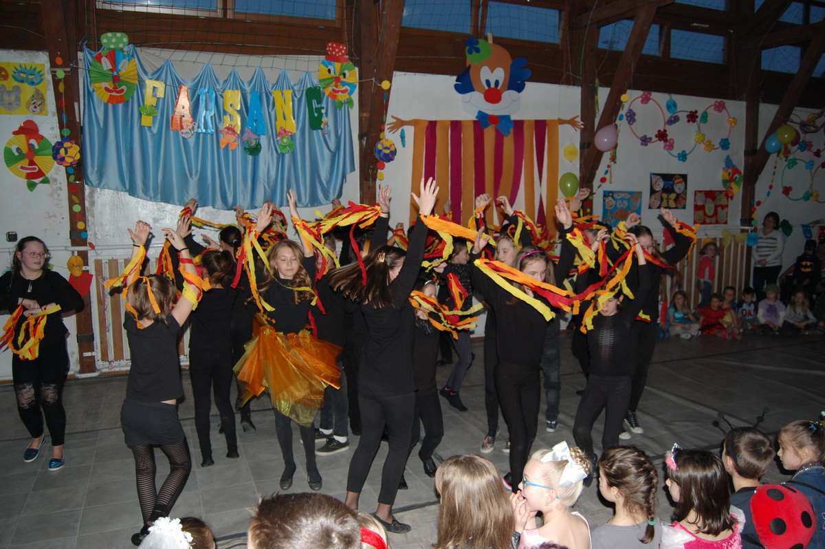 Február 17-én délután nagy izgalommal készülődtünk mi, alsósok a farsangra. Már hetekkel előtte táncot gyakoroltunk, beszélgettünk az ünnepről. Így nagy taps fogadta a három negyedik osztály remek produkcióját, akik törpikéknek (természetesen Hófehérkének és boszorkánynak is), pizzafutároknak és tűztáncosoknak öltöztek be és kápráztattak el bennünket.