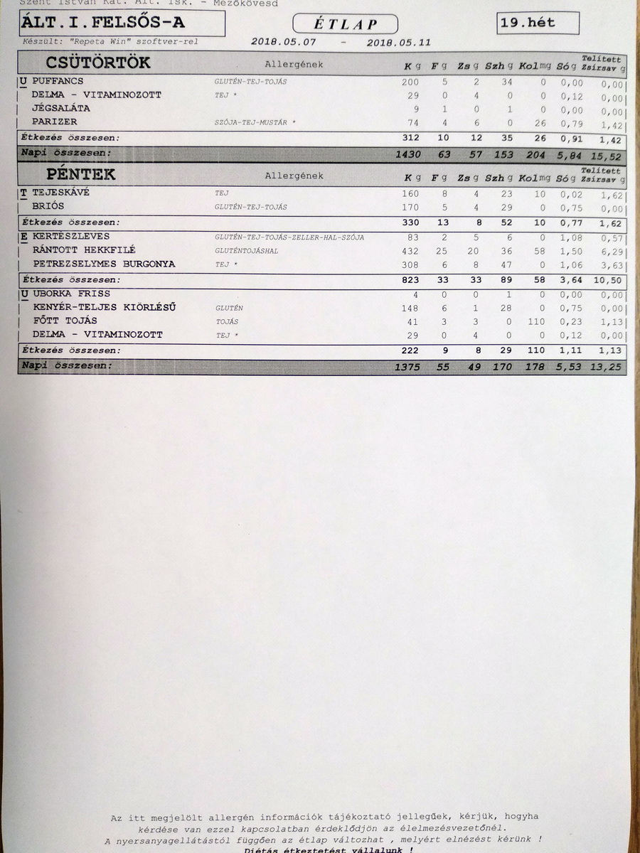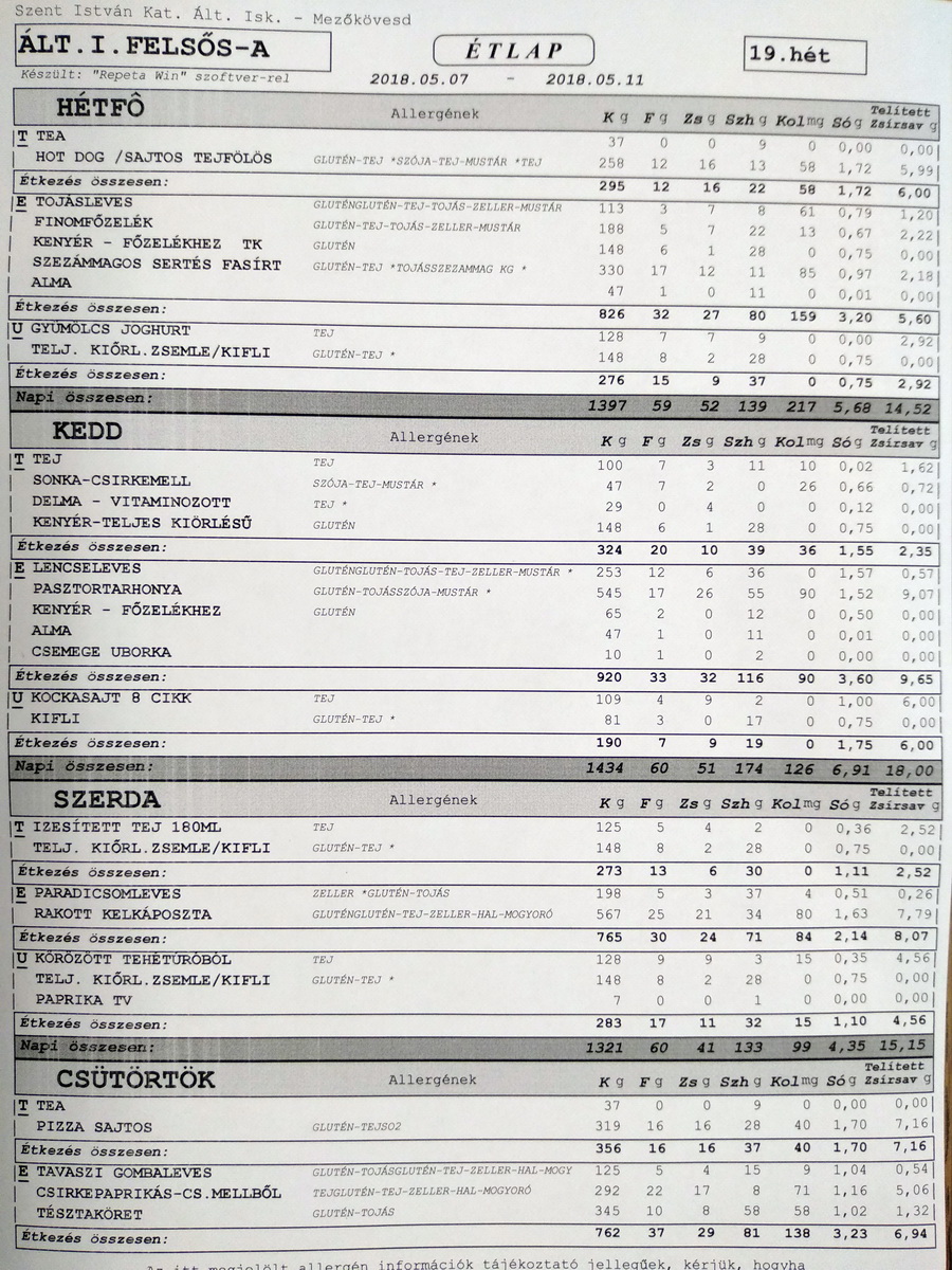 | Szerda | Ízesített tej, telj. kiőrl. kifli | Paradicsomleves, Rakott kelkáposzta | Körözött, kifli, paprika |