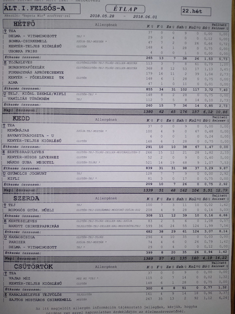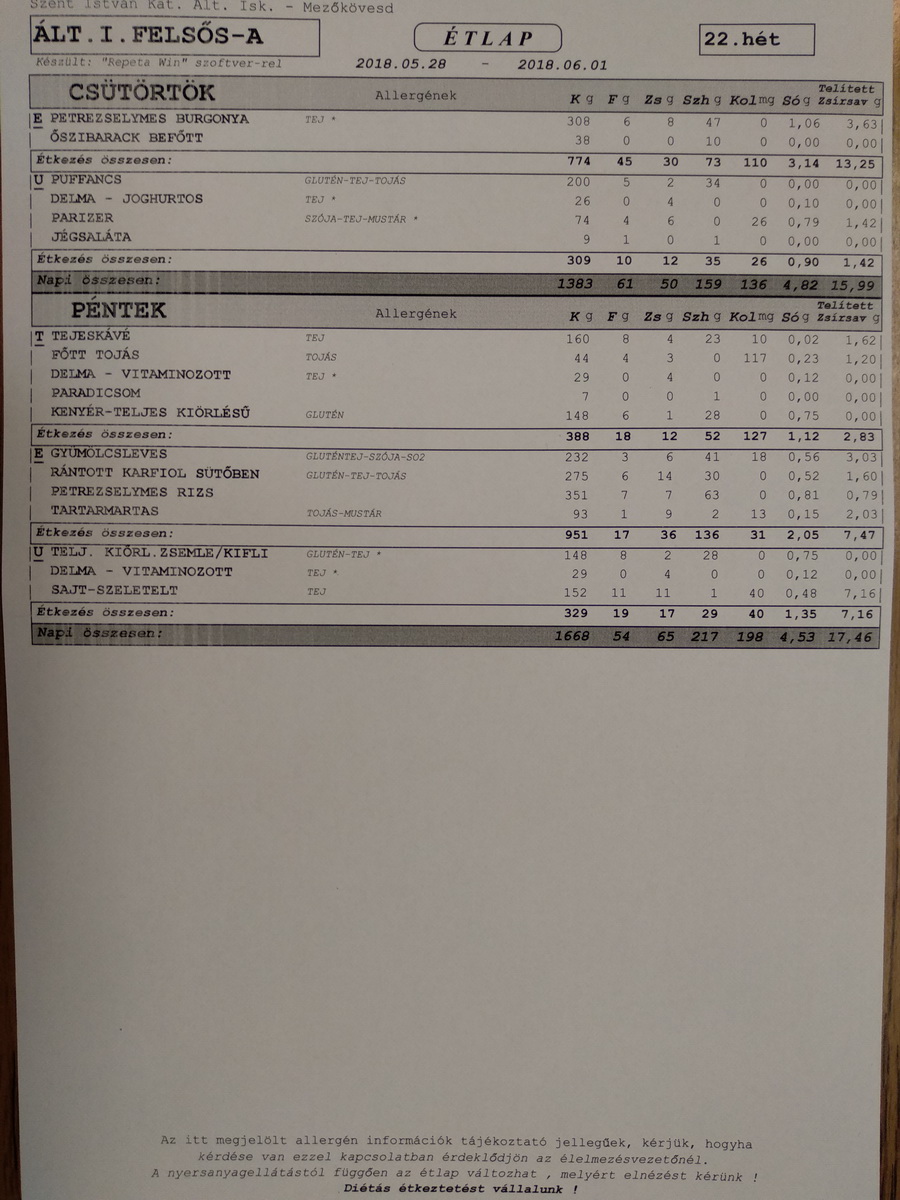 | Péntek | Tej, főtt tojás margarin Teljes kiőrlésű kenyér paradicsom |