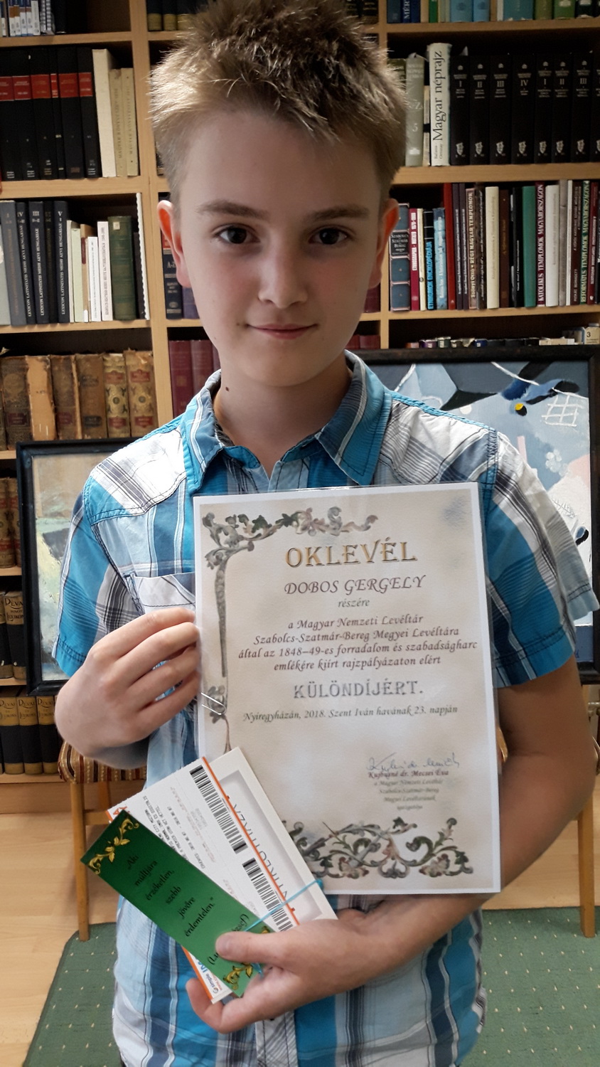Iskolánk tanulója, Dobos Gergely 6.b osztályos tanuló különdíjban részesült. Az eredményhirdetést a Múzeumok éjszakájához kapcsolódó Levéltári délutánon tartották meg, június 23-án 19 órától Nyíregyházán. A rajzokból 2019 márciusában kiállítást fognak készíteni.