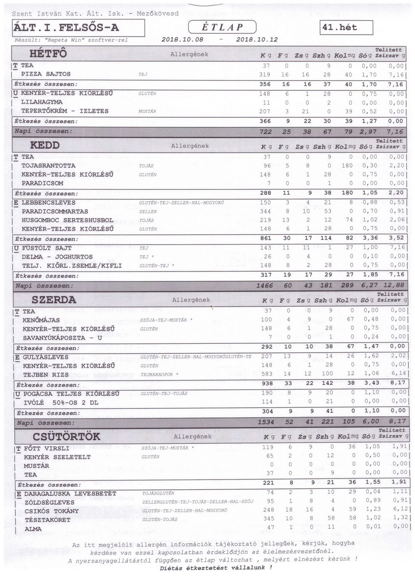 Kérjük az étkezési ill. elviteli szándékot hét elején, lehetőleg hétfőn jelezni, mert előfordulhat, hogy a későn leadott igényeket már nem tudjuk teljesíteni. Az étkezést az adott napon reggel 8:00-ig lehet lemondani.
