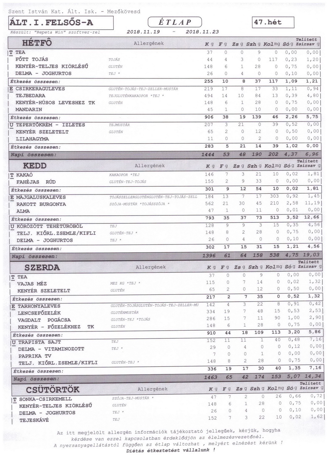 | Csütörtök | Tejeskávé Csirke mellsonka margarin Teljes kiőrlésű kenyér |