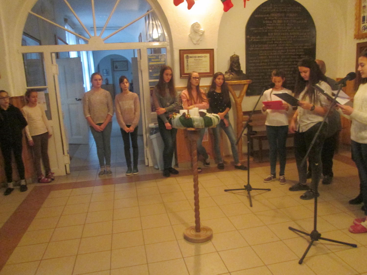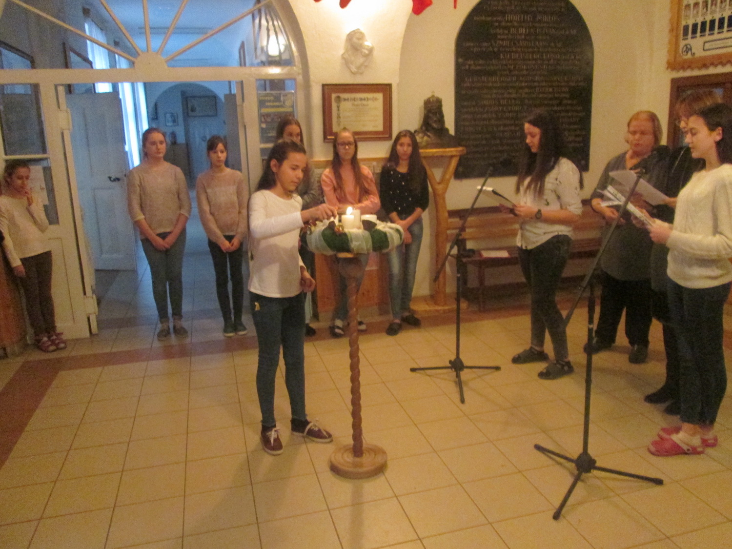 December 3-án reggel 8 órakor iskolánk adventi koszorúján meggyújtottuk az első adventi gyertyát. Az aulában tartott ünnepségen a 7/a osztályos tanulók vettek részt. A gyertyagyújtást adventi ének zárta.