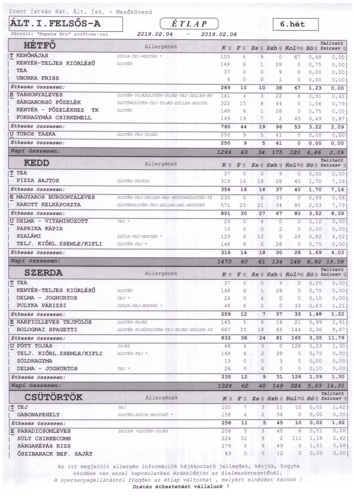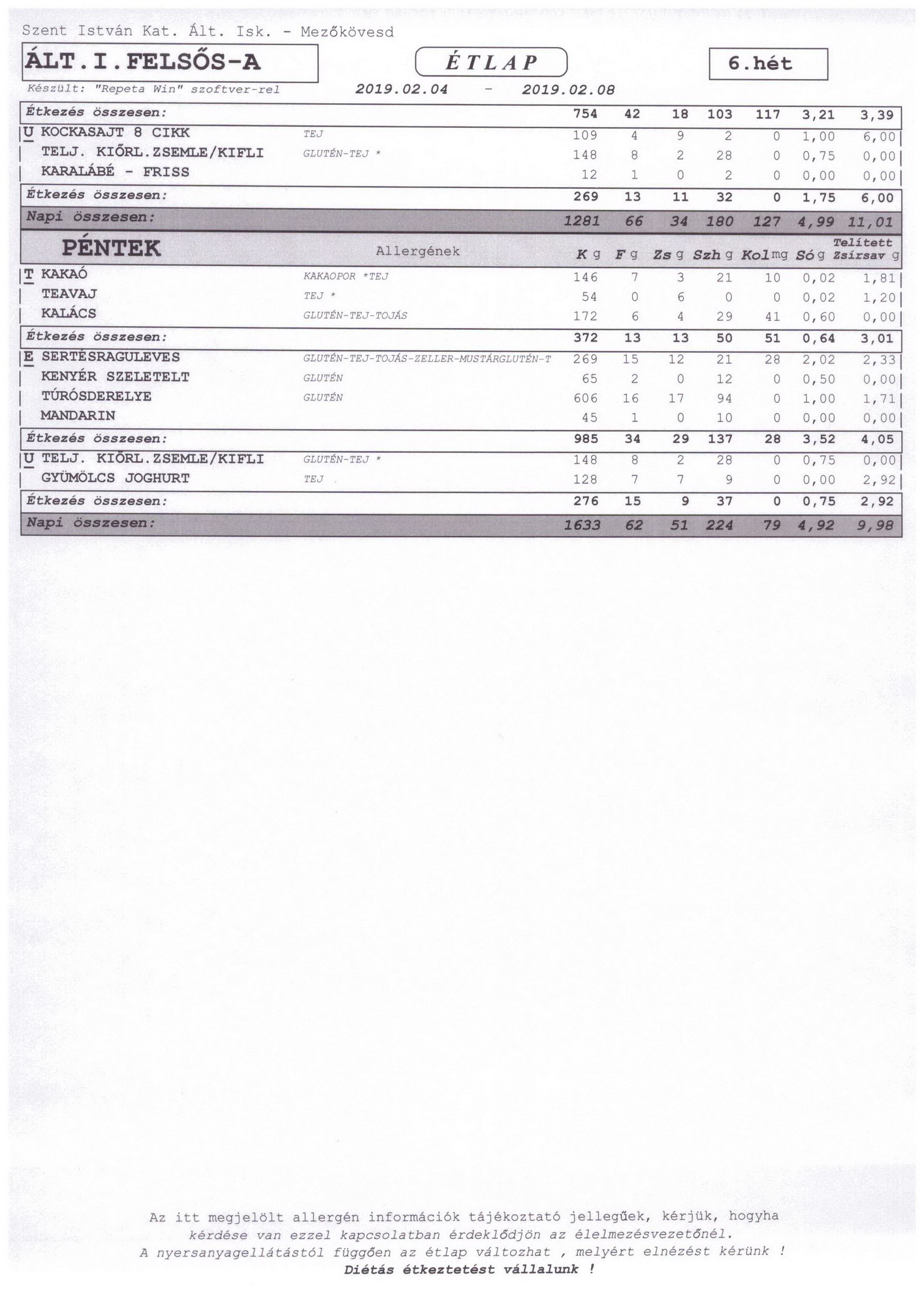 | Péntek | Kakaó, teavaj, kalács | Sertésraguleves Túrósderelye, mandarin |