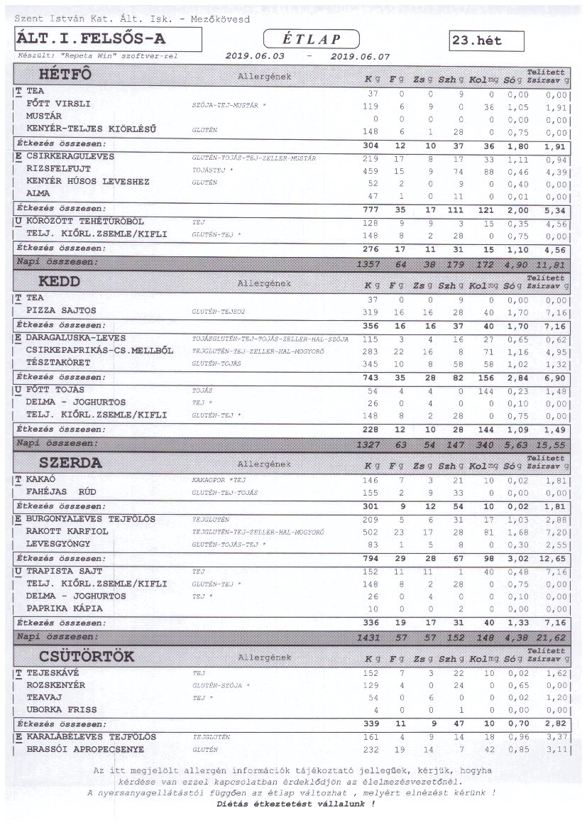 Kérjük az étkezési ill. elviteli szándékot hét elején, lehetőleg hétfőn jelezni, mert előfordulhat, hogy a későn leadott igényeket már nem tudjuk teljesíteni. Az étkezést az adott napon reggel 8:00-ig lehet lemondani.