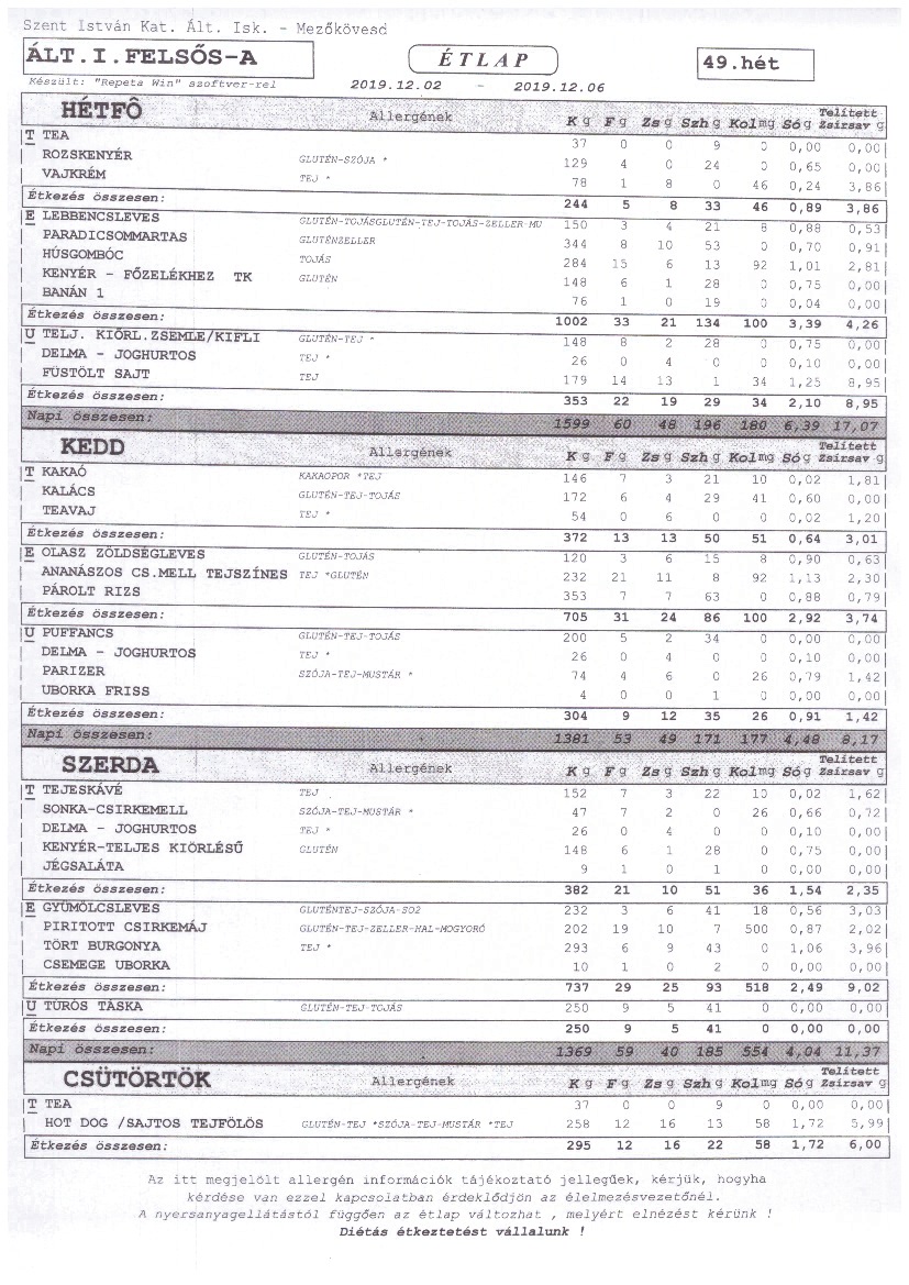 | Szerda | Tejeskávé csirkemell sonka margarin Teljes kiőrlésű kenyér jégsaláta |