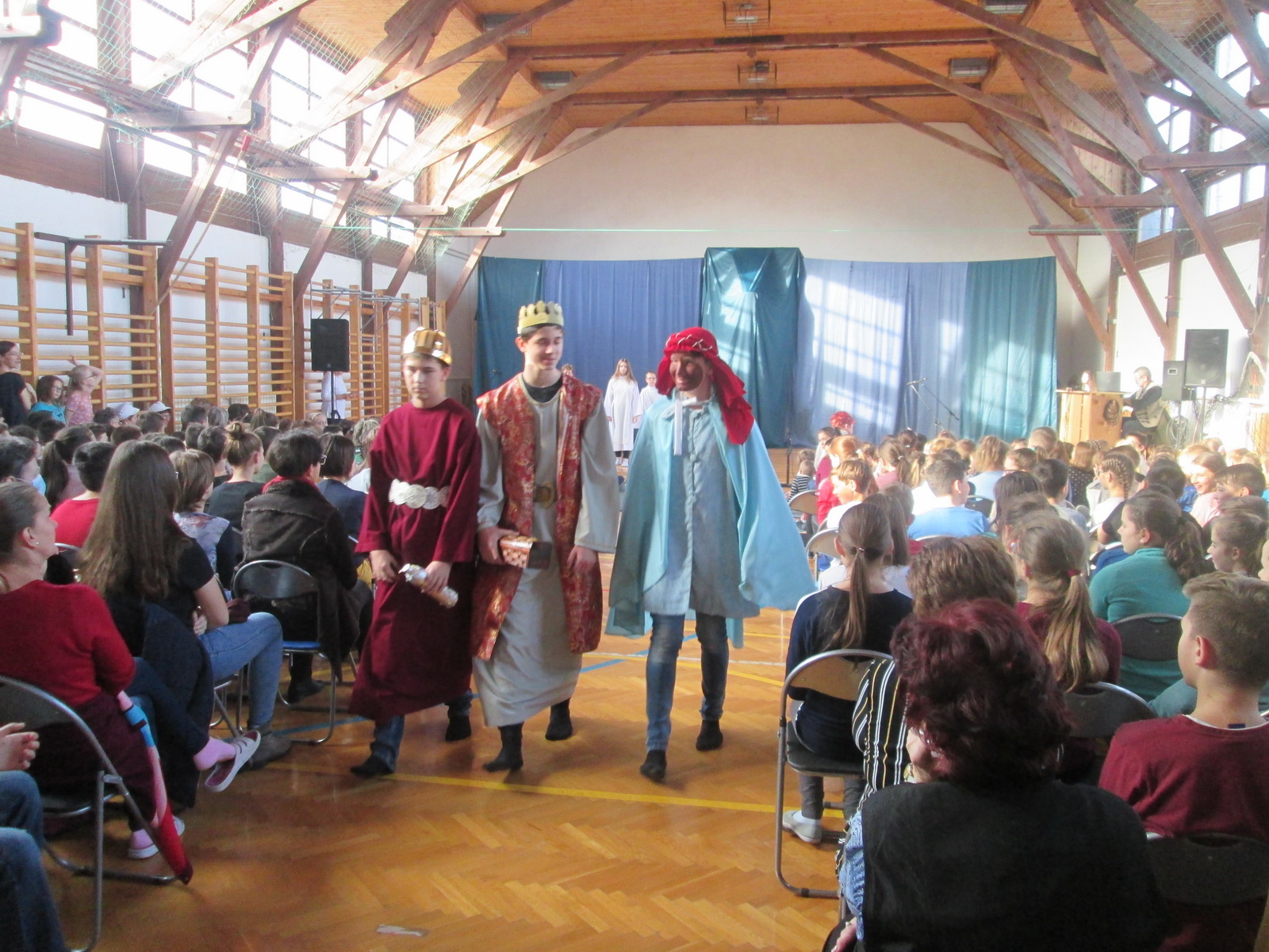 December 20-án, az utolsó tanítási napon a 4. órában tartottuk meg iskolánk karácsonyi ünnepségét a tornateremben, melyben a diákok és a tanárok pásztorjátékot tekinthettek meg.