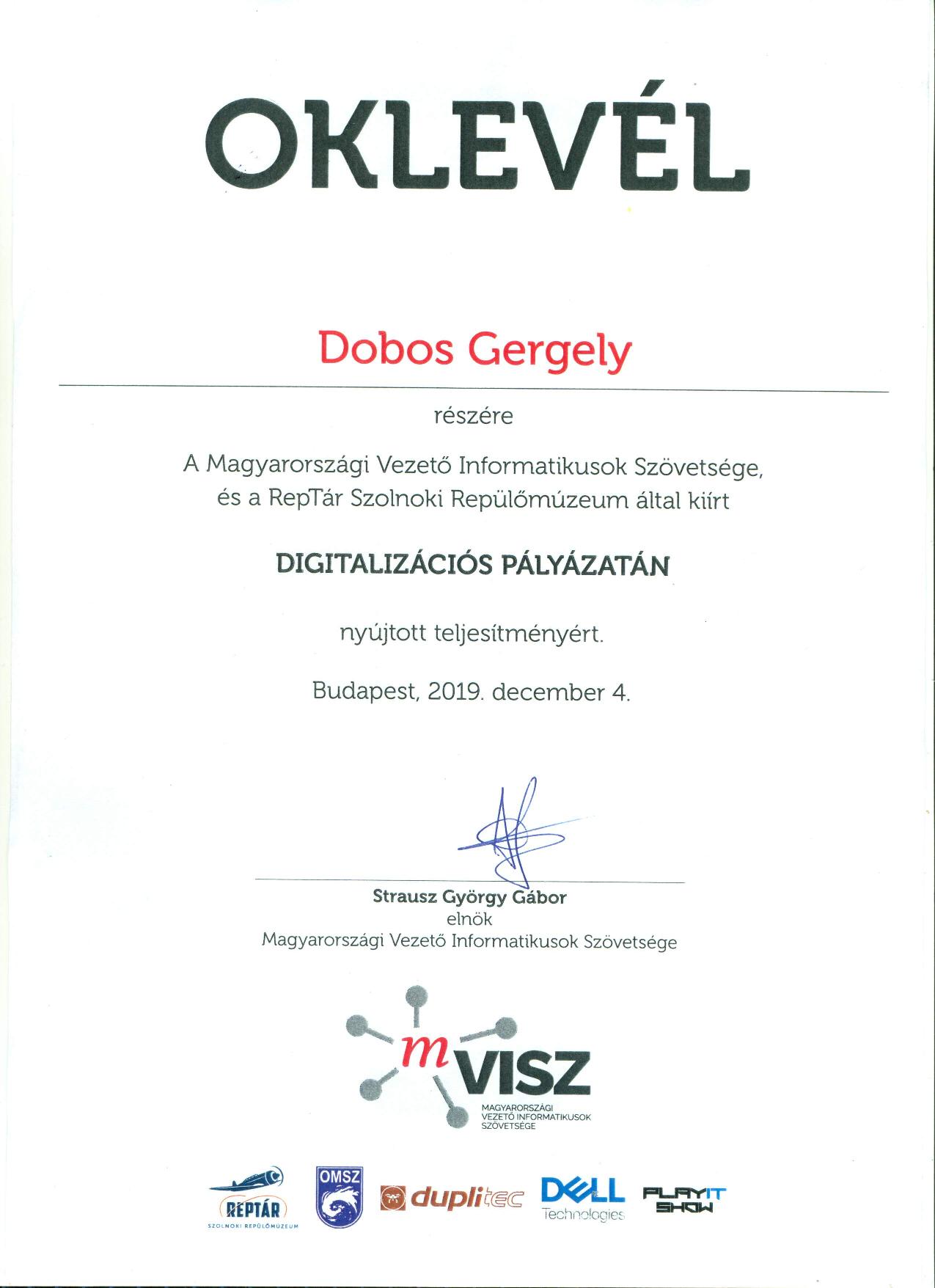 mVISZ(Magyarországi Vezető Informatikusok SZövetsége) rajz pályázatot hirdetett általános iskolásoknak, melyben a RepTár Szolnoki Repülőmúzeum kabalafiguráját kellett megtervezni. A rajz pályázaton Dobos Gergely 8. b. osztályos tanuló kategóriájában I. helyezést ért el és a zsűri döntése alapján, a külön díjat is az ő munkája érdemelte ki. Eredményéhez gratulálunk!