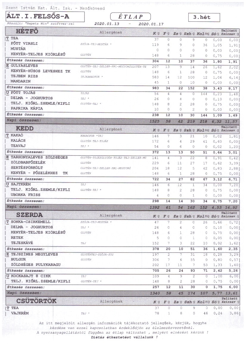 2020. január 1-től a Szent István Katolikus Általános Iskola étkezési térítési díjai: