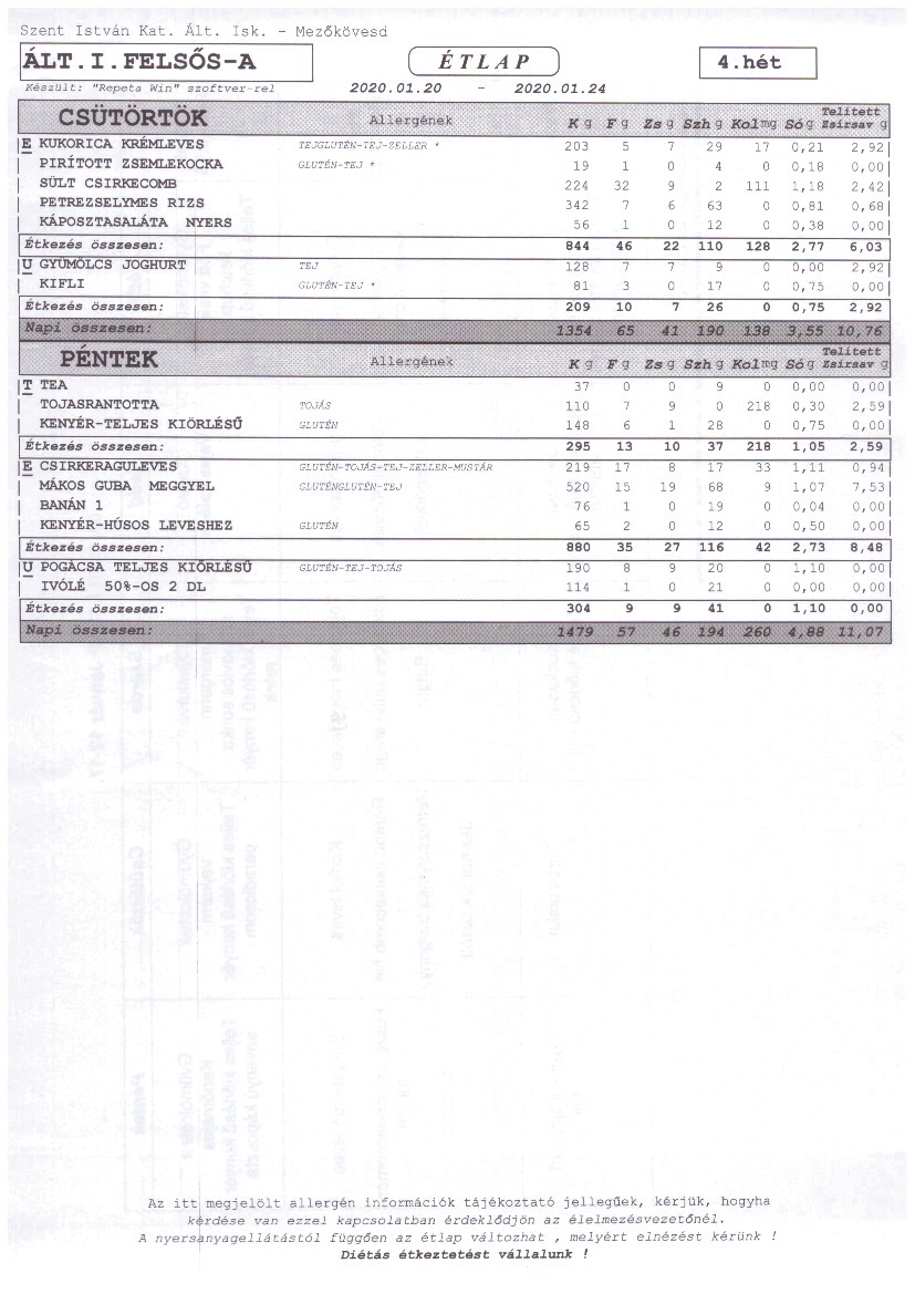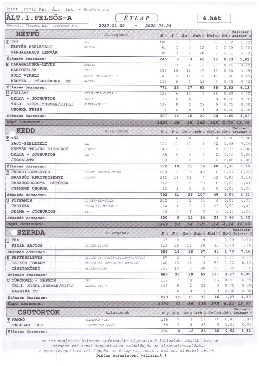 2020. január 1-től a Szent István Katolikus Általános Iskola étkezési térítési díjai: