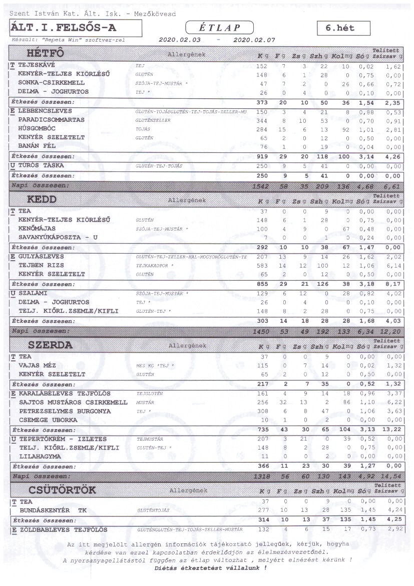 Kérjük az étkezési ill. elviteli szándékot hét elején, lehetőleg hétfőn jelezni, mert előfordulhat, hogy a későn leadott igényeket már nem tudjuk teljesíteni. Az étkezést az adott napon reggel 8:00-ig lehet lemondani.