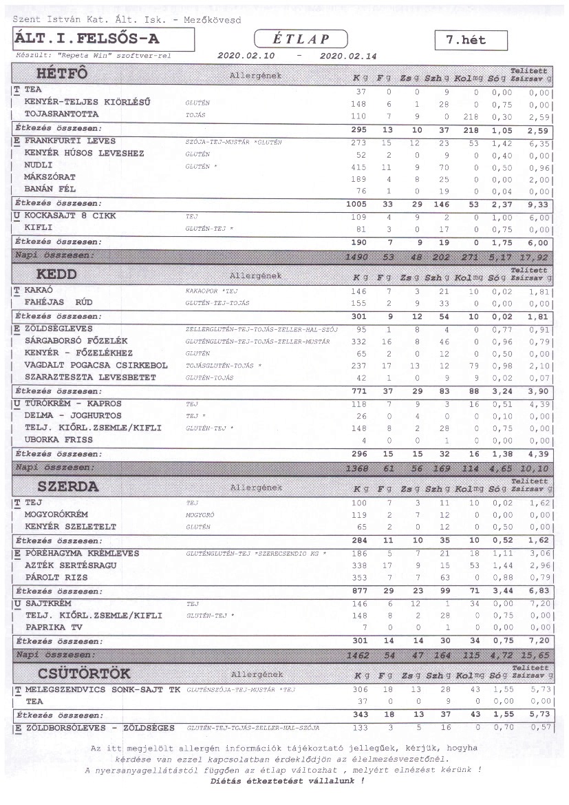 2020. január 1-től a Szent István Katolikus Általános Iskola étkezési térítési díjai: