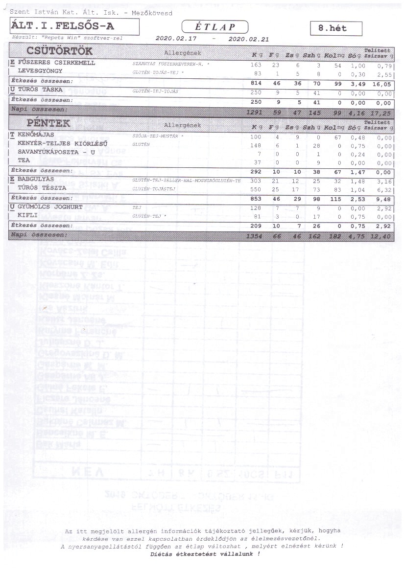 Kérjük az étkezési ill. elviteli szándékot hét elején, lehetőleg hétfőn jelezni, mert előfordulhat, hogy a későn leadott igényeket már nem tudjuk teljesíteni. Az étkezést az adott napon reggel 8:00-ig lehet lemondani.