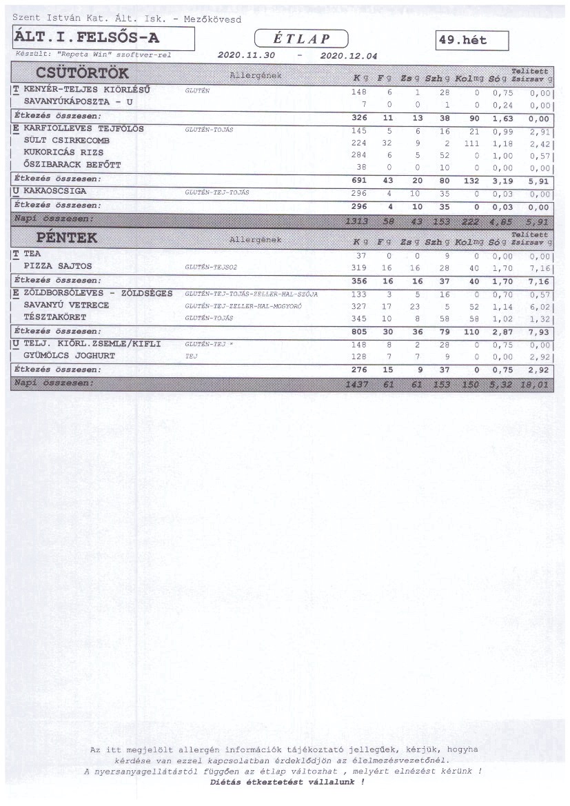 | Csütörtök | Gyümölcstea Kenőmájas Teljes kiőrlésű kenyér savanyú káposzta |
