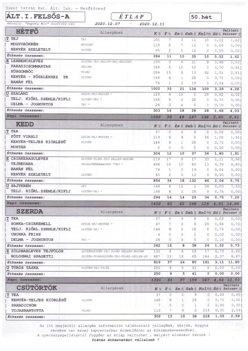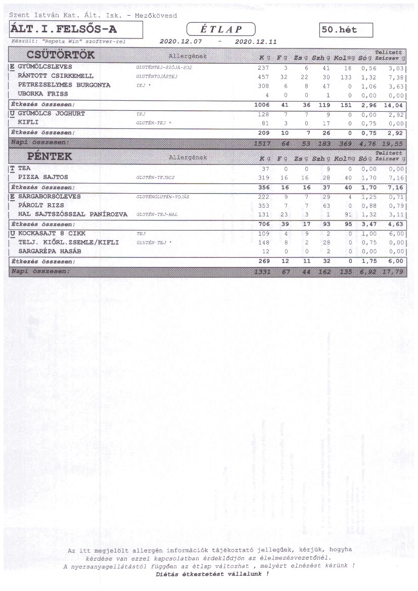 2020. január 1-től a Szent István Katolikus Általános Iskola étkezési térítési díjai: