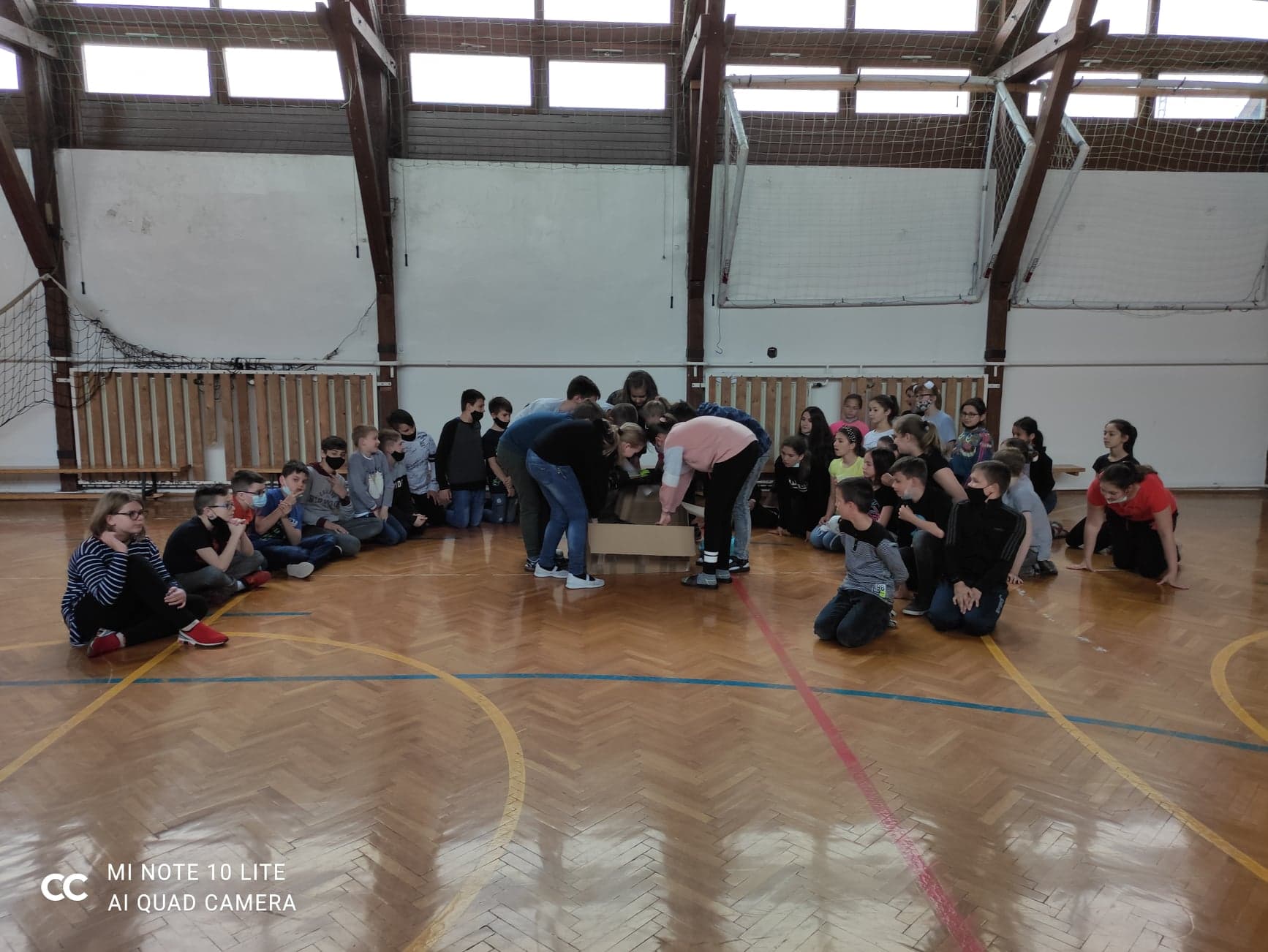 A gyerkőcök nagyon várták a végeredményt. Sikeres volt a munkájuk, mert az iskolánk megnyerte a sok-sok pályázó iskola közül az egy doboznyi, 40 000 Ft. értékű udvari játékot.