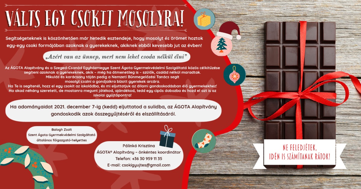 Válts egy csokit mosolyra! Szent István Katolikus Általános Iskola és Óvoda Közzétéve 2021-11-16 , Kiss Asztrik2021-11-16