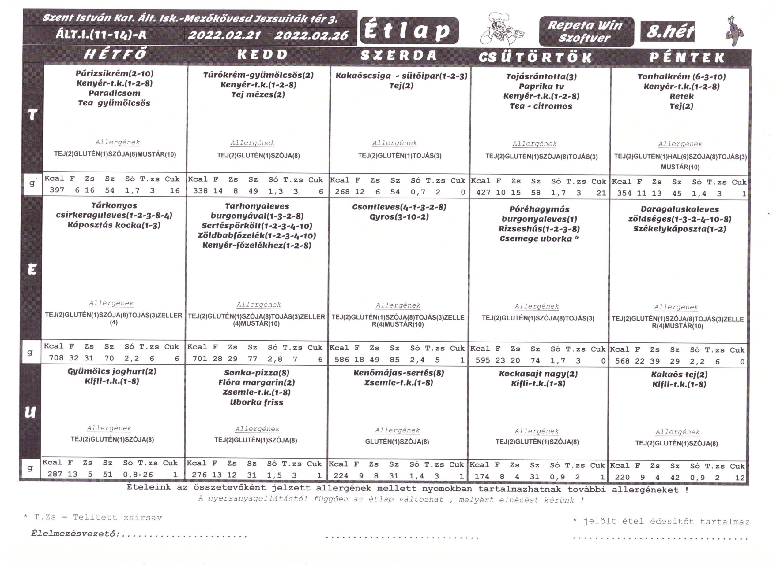 Kérjük az étkezési ill. elviteli szándékot hét elején, lehetőleg hétfőn jelezni, mert előfordulhat, hogy a későn leadott igényeket már nem tudjuk teljesíteni. Az étkezést az adott napon reggel 8:00-ig lehet lemondani.