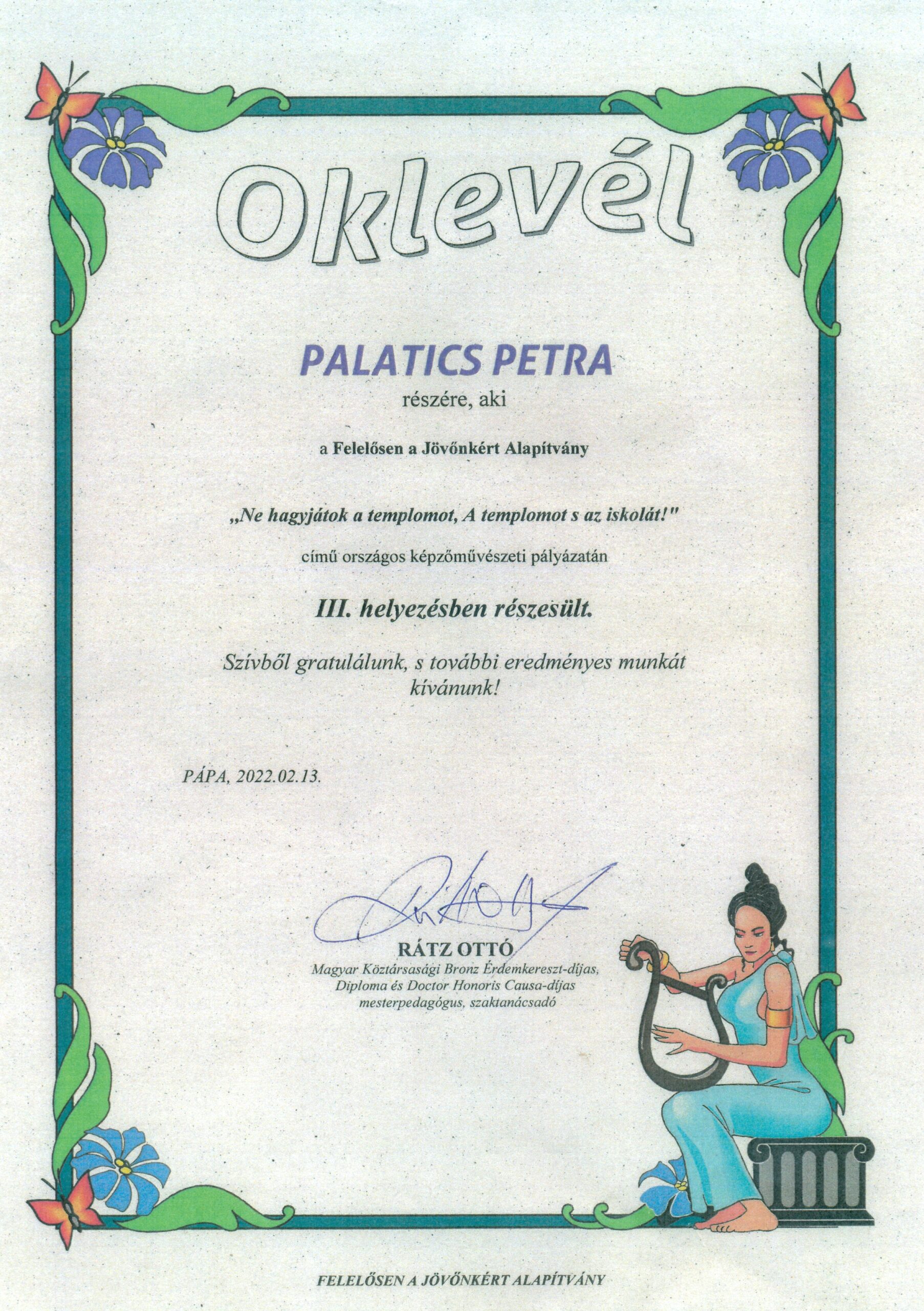 A pályázatot 2021. decemberében hirdette meg a Felelősen a Jövőnkért Alapítvány. „Ne hagyjátok a templomot, A templomost s az iskolát!” témakörben Palatics Petra III. helyezést ért el! Szívből gratulálunk!