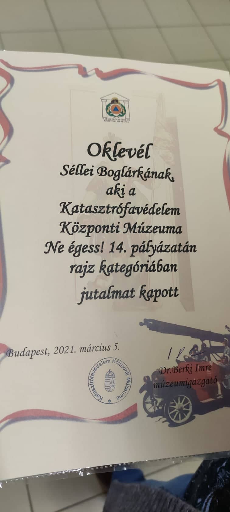 Séllei Boglárka 2. a. osztályos tanuló a pályázaton oklevélben és jutalomban részesült.