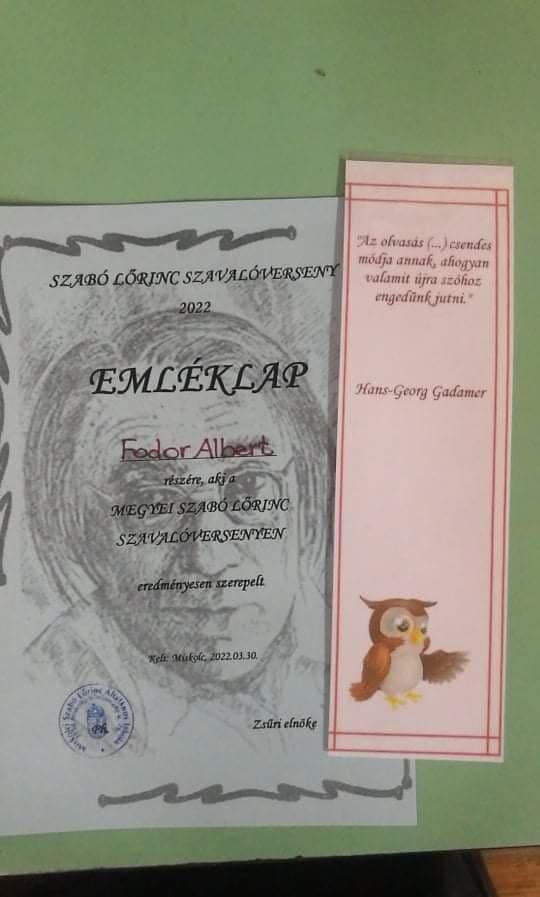 Első osztályból Fodor Albert oklevélben részesült eredményes szerepléséért. Kovács Eszter 1. b osztályos tanuló pedig különdíjas lett. A negyedik osztályos Tarcsa Viktória szintén oklevélben részesült eredményes szerepléséért. A gyerekek nagyon ügyesen teljesítettek.