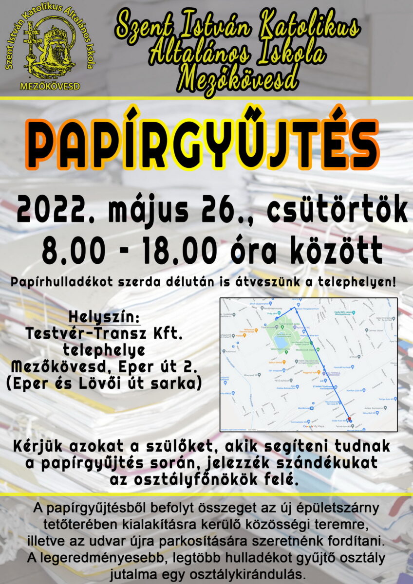 Iskolánk az idei tanévben is papírgyűjtést szervez a Testvér Transz Kft telephelyén (lásd csatolt térképen, Mezőkövesd, Eper út 2. /Eper és Lövői út sarka/)