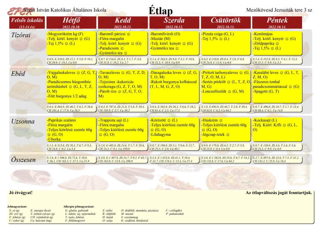 2022. szeptember 1-től a Szent István Katolikus Általános Iskola étkezési térítési díjai: