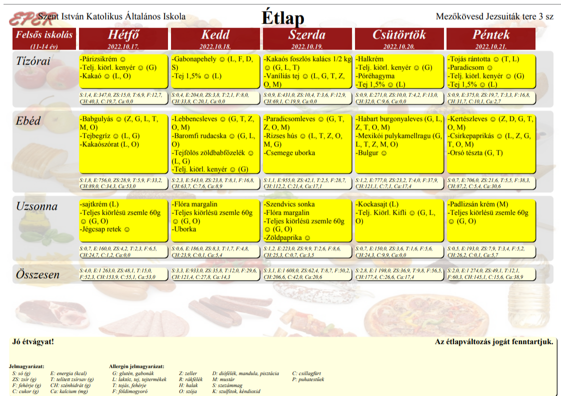 2022. szeptember 1-től a Szent István Katolikus Általános Iskola étkezési térítési díjai: