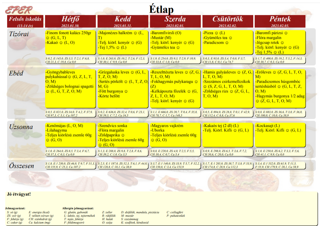 Kérjük az étkezési ill. elviteli szándékot hét elején, lehetőleg hétfőn jelezni, mert előfordulhat, hogy a későn leadott igényeket már nem tudjuk teljesíteni. Az étkezést az adott napon reggel 8:00-ig lehet lemondani.