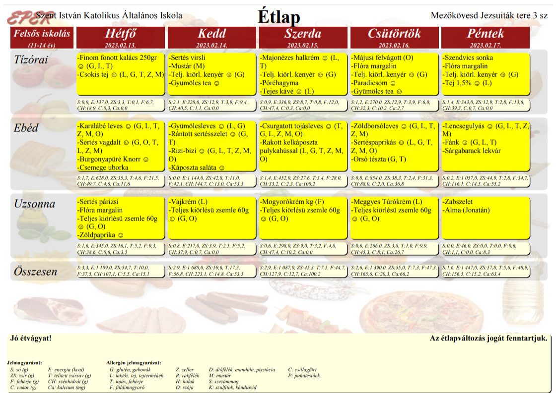 Kérjük az étkezési ill. elviteli szándékot hét elején, lehetőleg hétfőn jelezni, mert előfordulhat, hogy a későn leadott igényeket már nem tudjuk teljesíteni. Az étkezést az adott napon reggel 8:00-ig lehet lemondani.