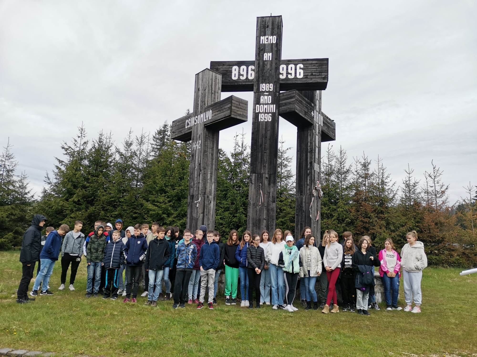 Gyimesbükkre vezetett utunk, ahol az ezeréves határnál Deáky András történelem előadását hallgatthattuk meg. A Csíksomlyói kegytemplomban iskolánk tanulóiért imádkoztunk és elénekeltünk egy Mária éneket. Innen felgyalogoltunk a Nyeregbe, ahol a csíksomlyói búcsút szokták tartani. A dombtetőn a gyönyörű kilátás mellett a visszhangot nagyon érdekesnek találtuk.