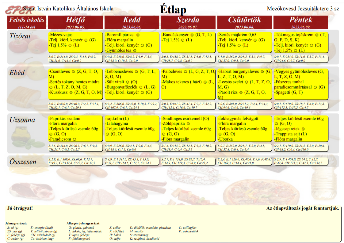 2022. szeptember 1-től a Szent István Katolikus Általános Iskola étkezési térítési díjai: