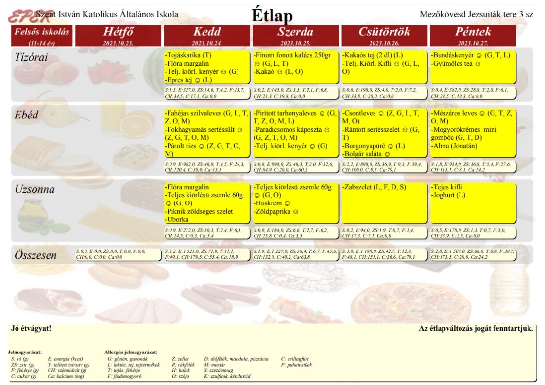 2023. szeptember 1-től a Szent István Katolikus Általános Iskola étkezési térítési díjai: