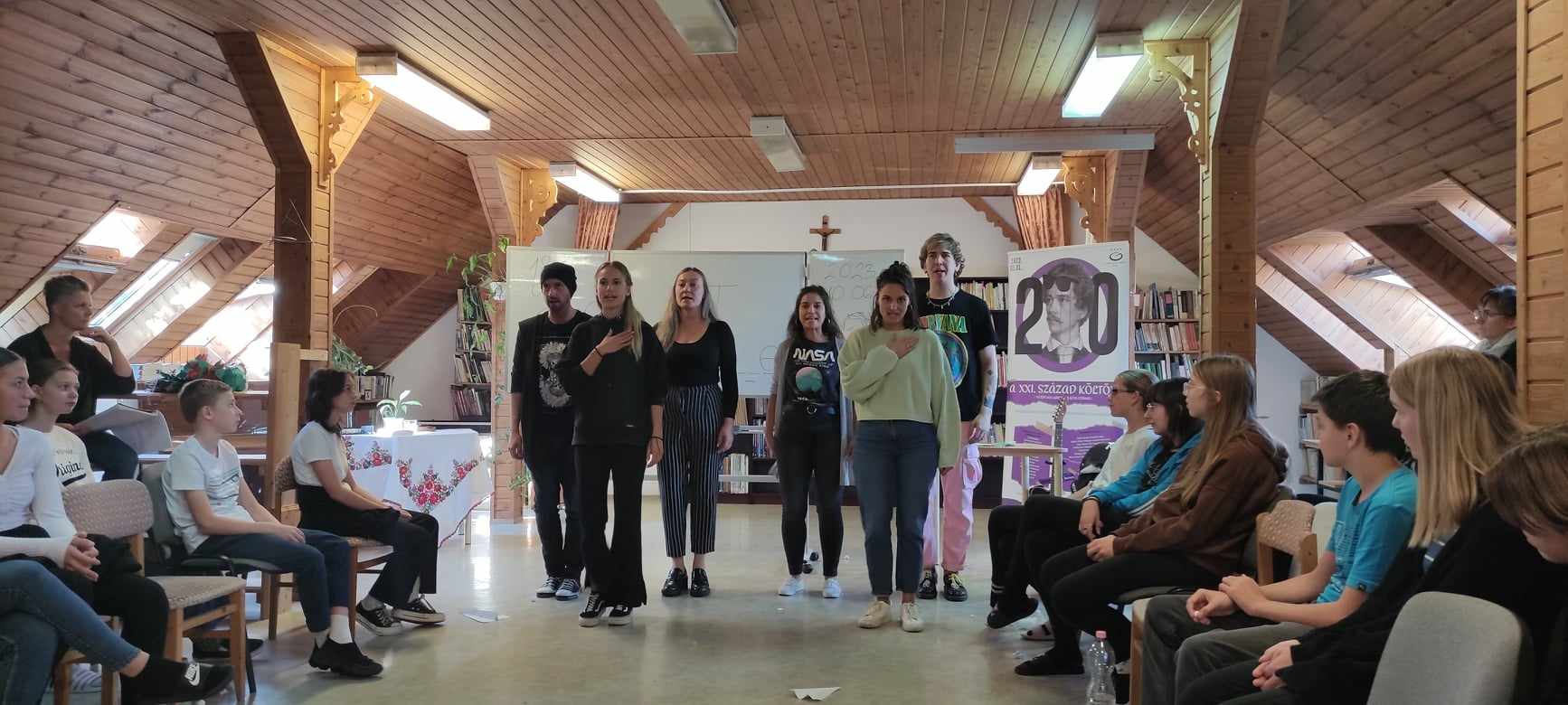 Petőfi Sándor születésének 200. évfordulója alkalmából tantermi előadásukkal a költő rövid, de rendkívüli gondolatokkal teljes életének egyes pillanatait közvetítették felénk, segítségül hívták a verseit, zenés, énekes elemekkel ötvözve.