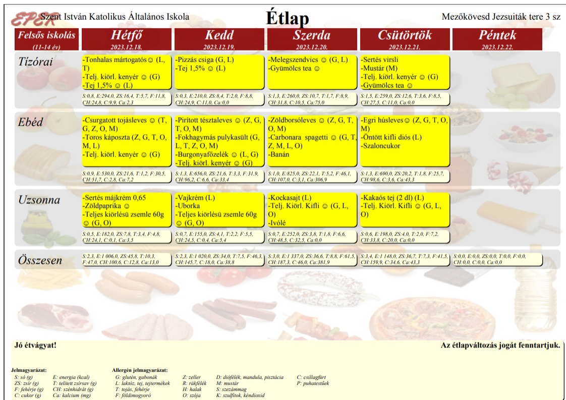 2023. szeptember 1-től a Szent István Katolikus Általános Iskola étkezési térítési díjai: