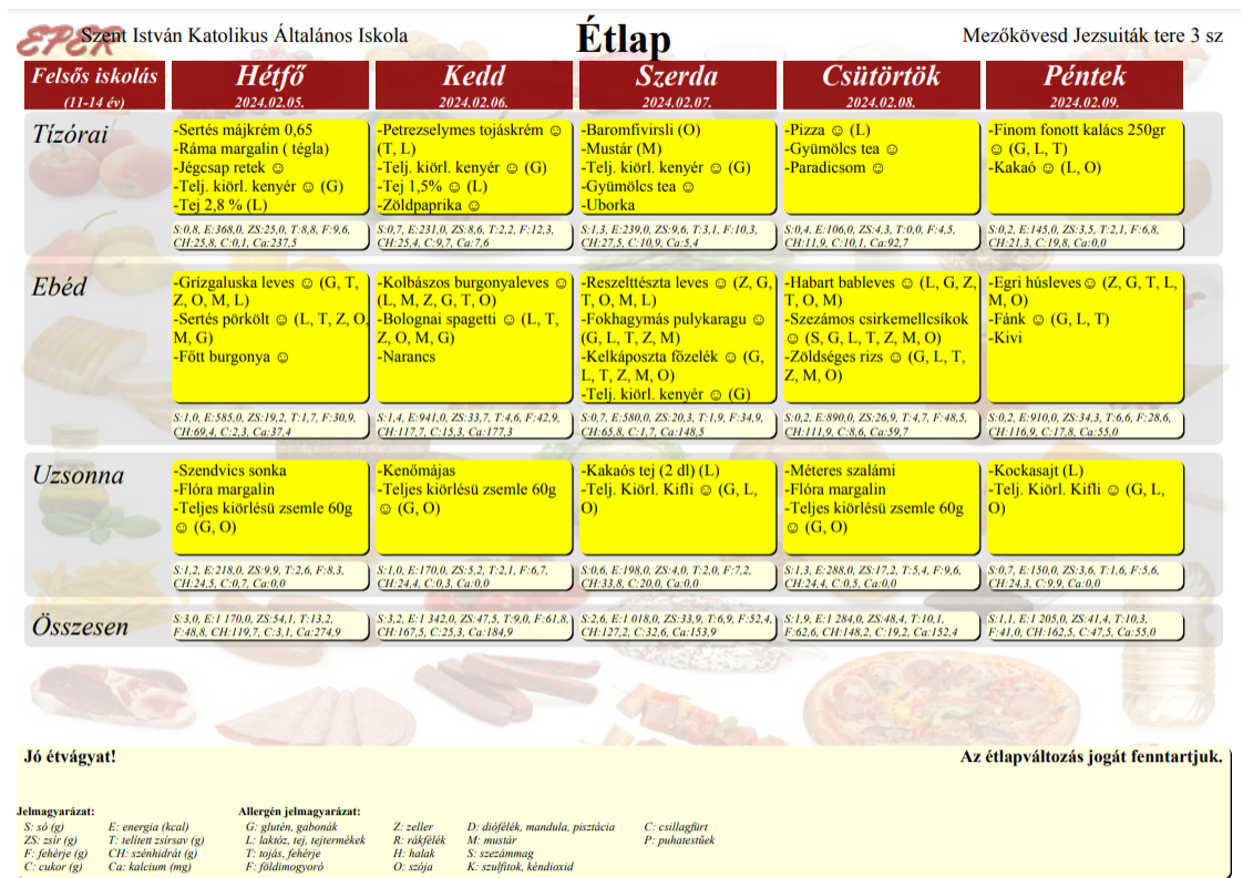 2023. szeptember 1-től a Szent István Katolikus Általános Iskola étkezési térítési díjai: