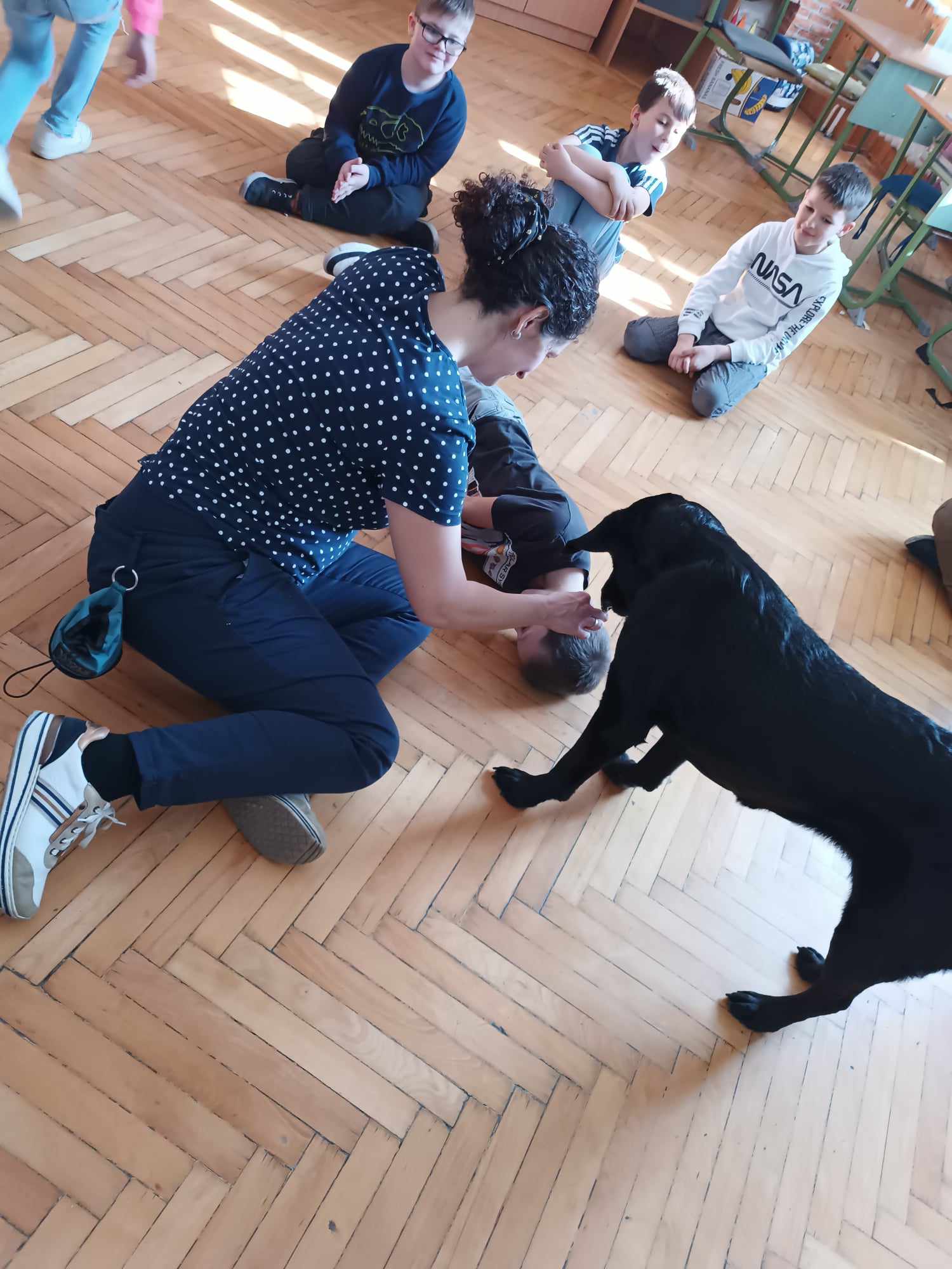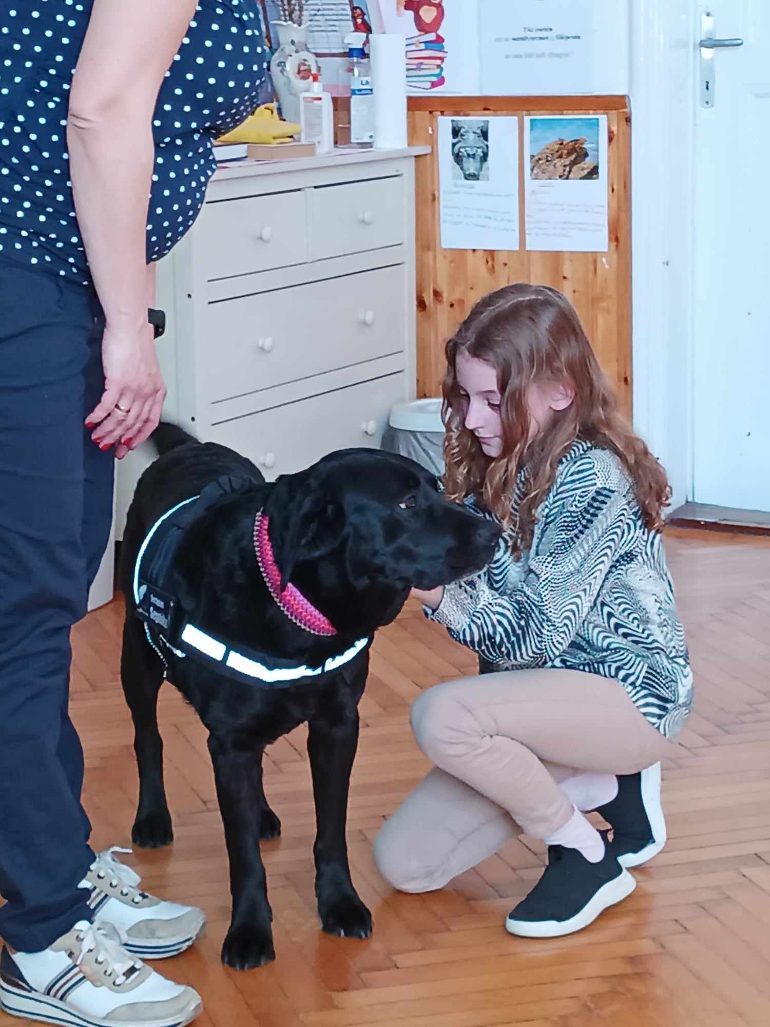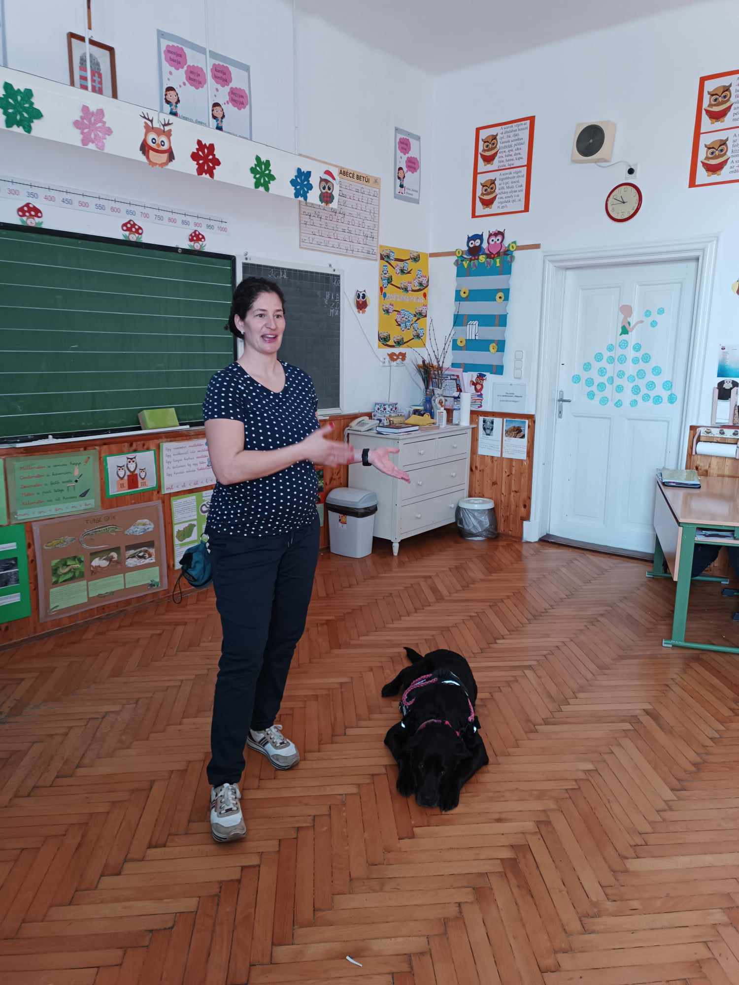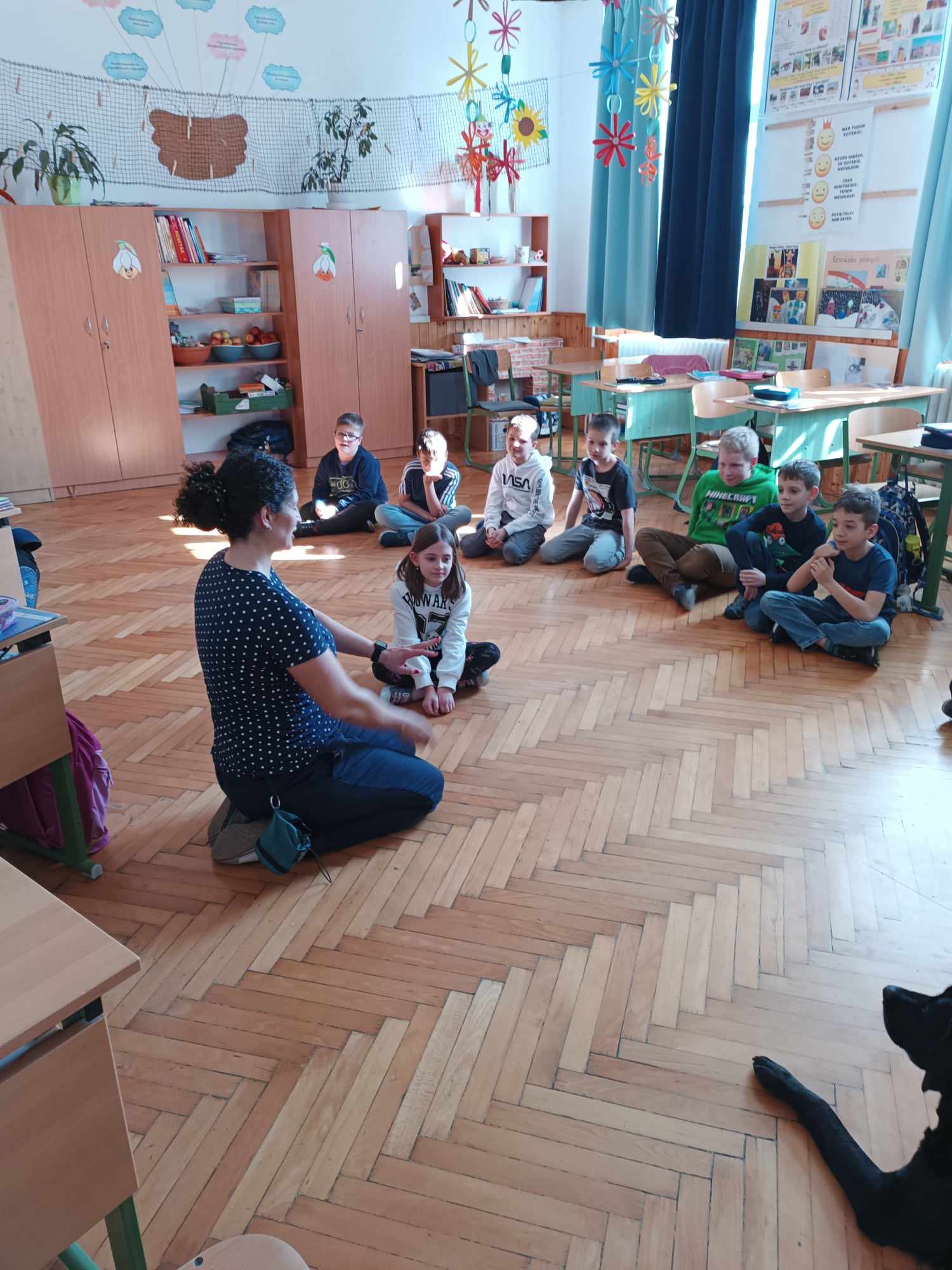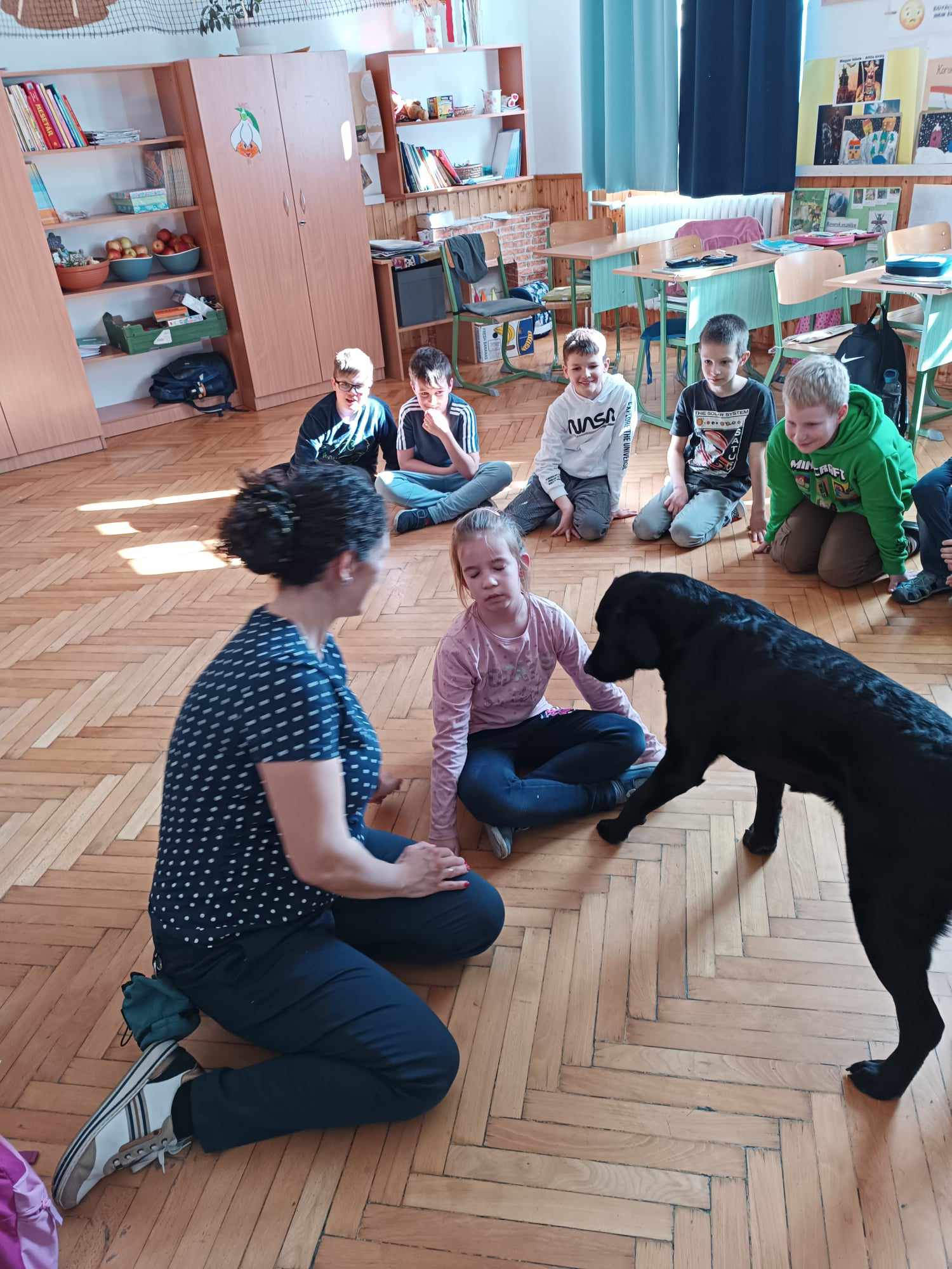 Berecz Ádám édesapja jóvoltából, a 3. a osztályba ellátogatott Ági néni, Csente nevű kutyájával. A foglalkozás elején hosszasan beszélgettünk a segítő kutyákról. Felsoroltuk ezeket és megvitattuk, hogy melyiknek mi a feladata. Ezek után bemutatta a 6 éves, fekete labrador kutyáját. Mindenki egyenként bemutatkozott neki egy pacsival. A legélvezetesebb rész következett, bemutatta az évek alatt megtanult trükkjeit. Szájtátva néztük a mutatványait. Jókat kacagtunk azon a feladaton, amikor a kutyát kellett utánoznunk. Később egy