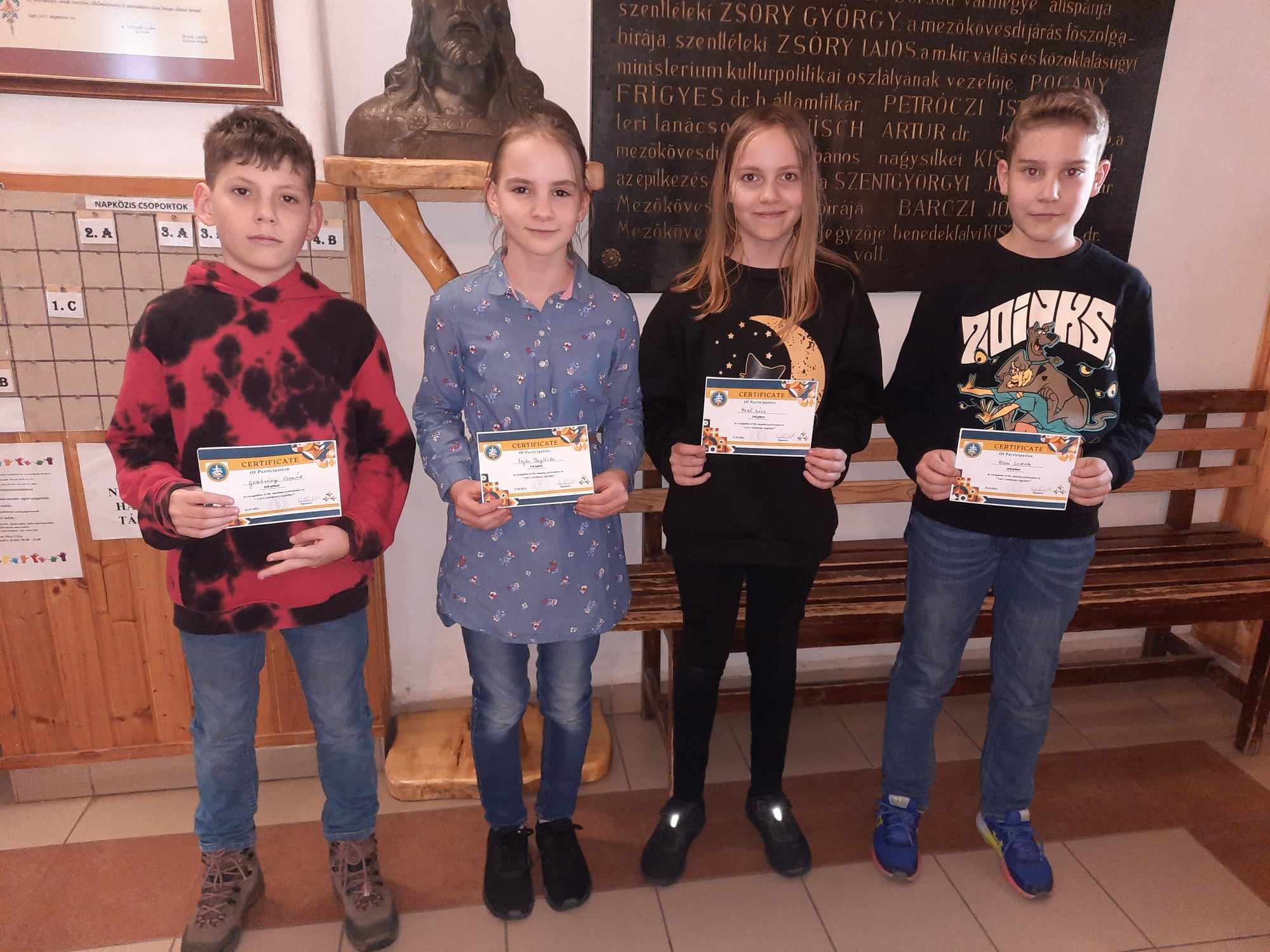 Az egri Szent Imre Katolikus Általános Iskola és Jó Pásztor Óvoda fennállásának 30. évfordulója alkalmából megrendezett angol nyelvi versenyen az 5.-6.osztályosok korcsoportjában iskolánk a dobogós 3.helyen szerepelt. A csapat tagjai: Mező Dóra (5.a), Fajta Boglárka (5.a), Hossó Levente (5.a), Gesztiványi Csanád (5.b).