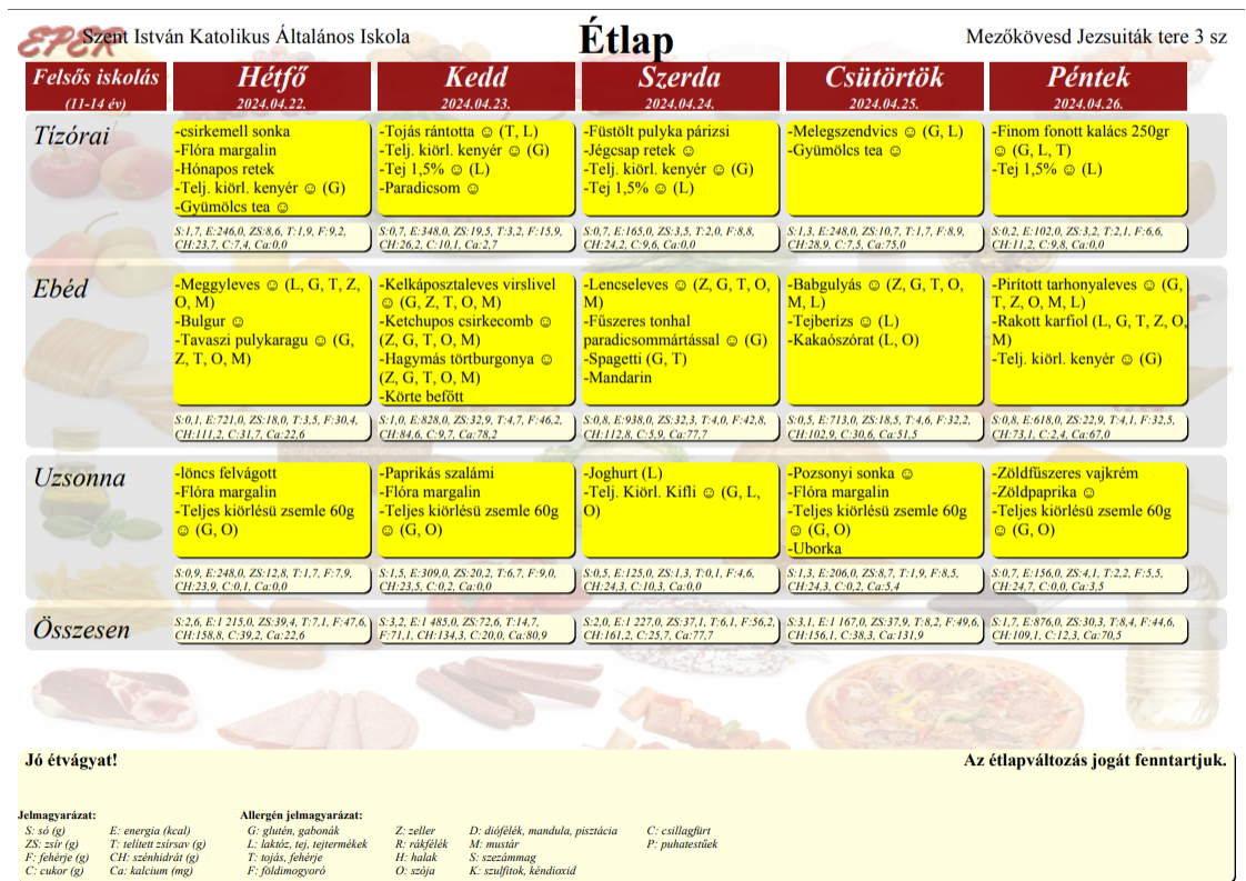 Kérjük az étkezési ill. elviteli szándékot hét elején, lehetőleg hétfőn jelezni, mert előfordulhat, hogy a későn leadott igényeket már nem tudjuk teljesíteni. Az étkezést az adott napon reggel 8:00-ig lehet lemondani.