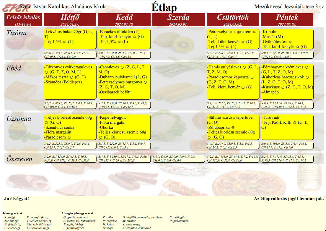 2023. szeptember 1-től a Szent István Katolikus Általános Iskola étkezési térítési díjai: